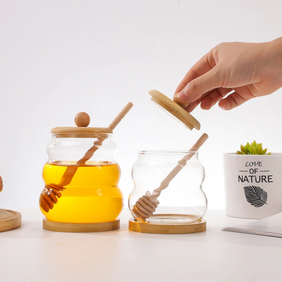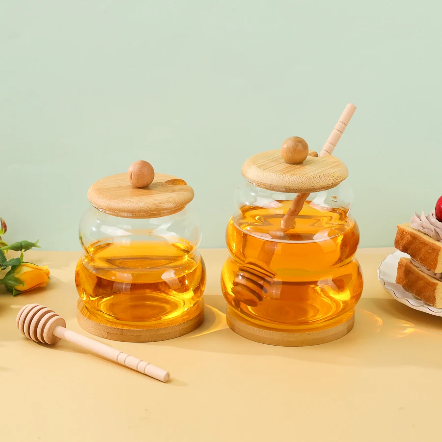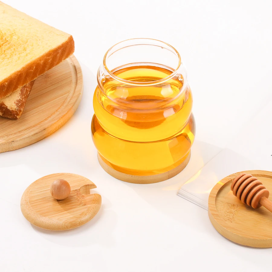 Name | Bulk High Quality 330ml 450ml Transparent Empty Glass Honey Pot Jars With Wooden Lid Spoon and Dipper |