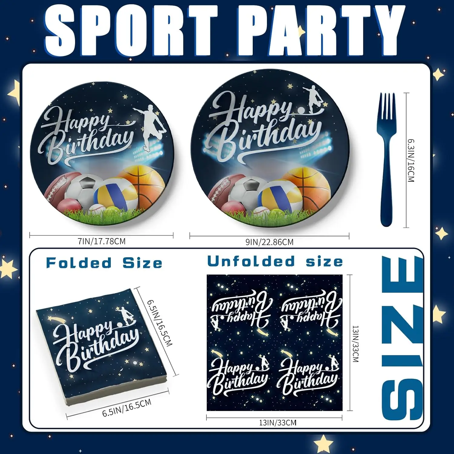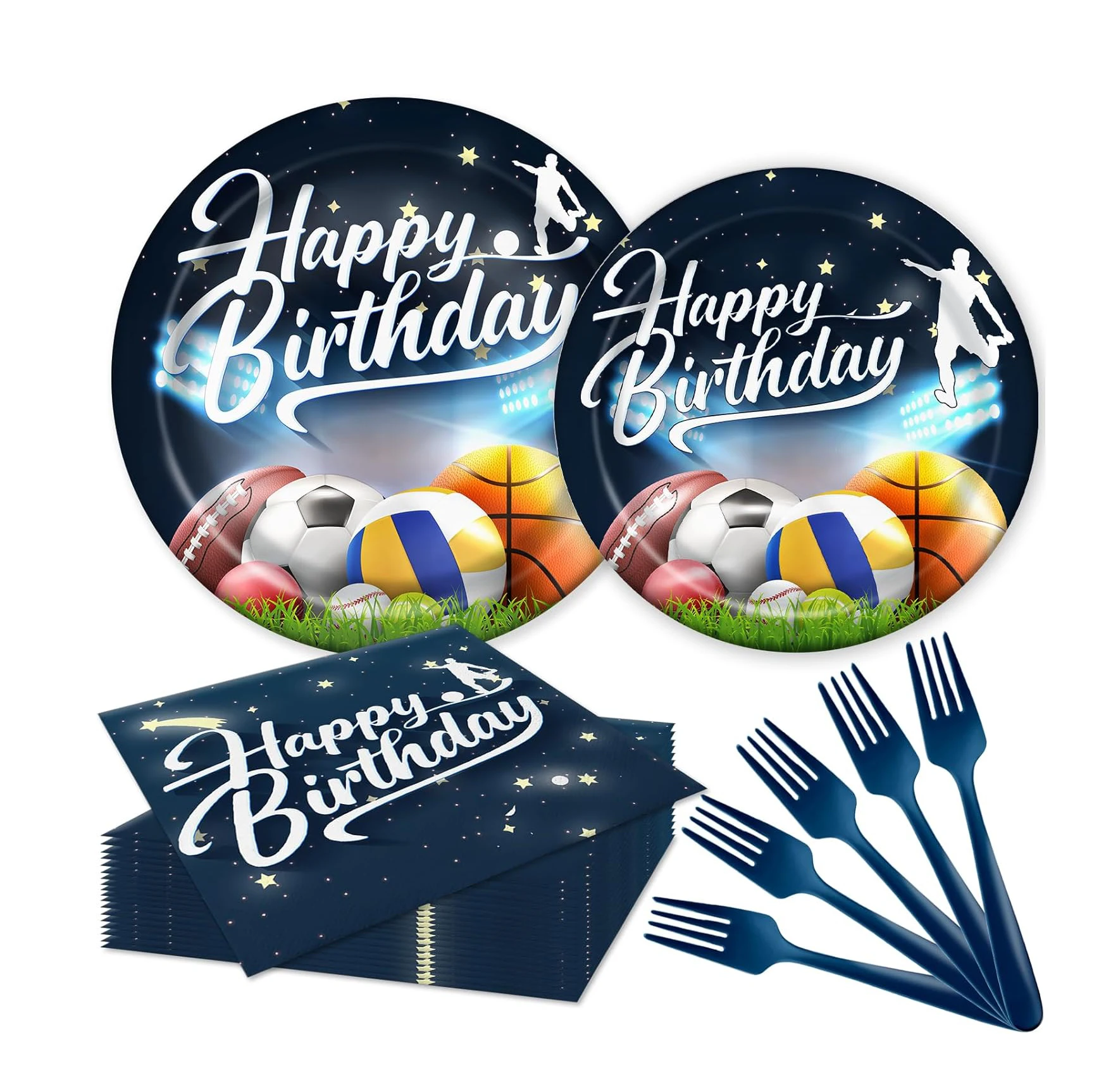 10pcs 7inch plates, 10pcs 9inch plates, 20pcs napkins, 10pcs cups, 10pcs banners, 10pcs straws, 1pcs tablecloths, 10pcs forks, 10pcs spoons, 10pcs knifes, 1pcs cake flag, 24pcs cupcake flag.