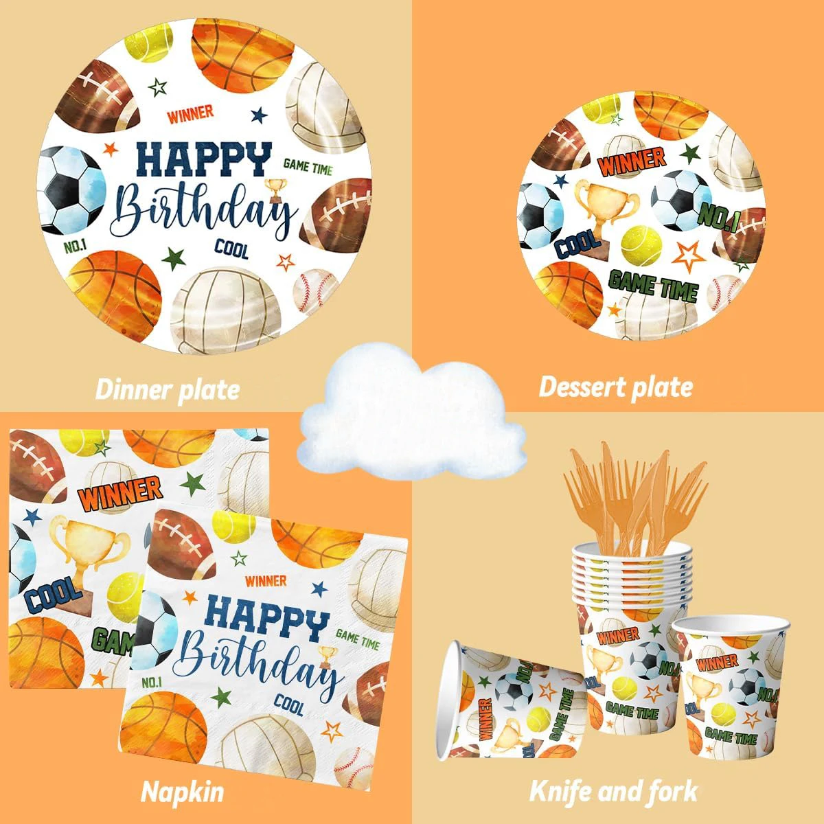 Party Set(8Items) | 10pcs 7inch plates, 10pcs 9inch plates, 20pcs napkins,10pcs cups, 10pcs banners, 1pcs tablecloths, 1pcs cake flag, 24pcs cupcake flag. | ||||||