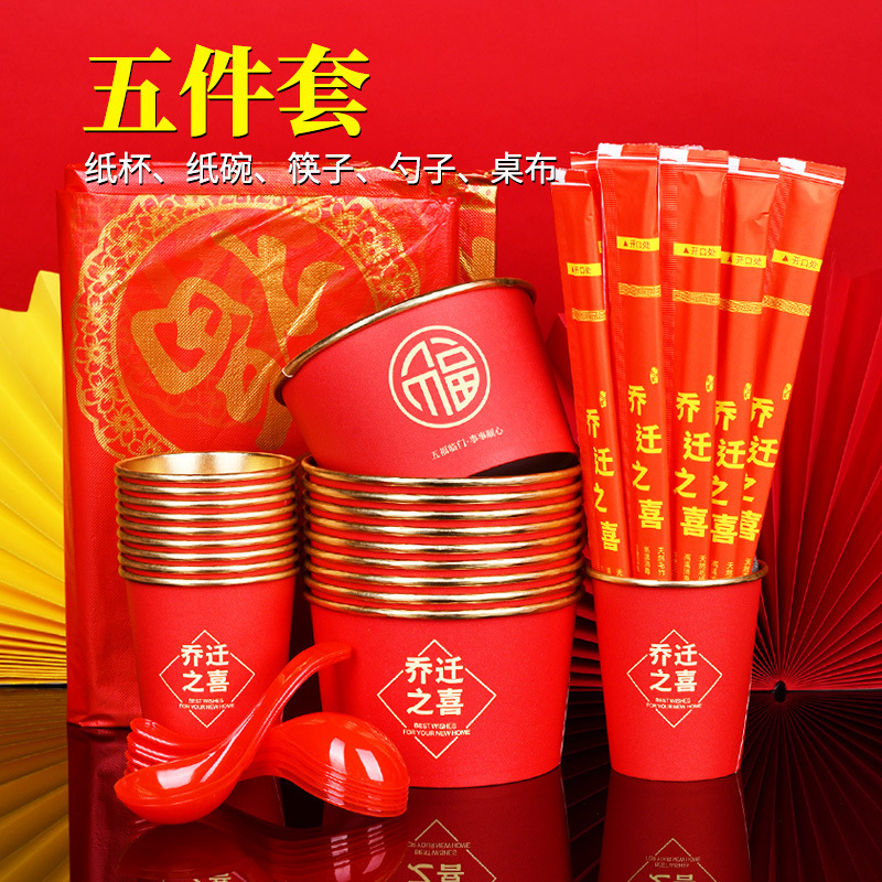 [five-piece set of housewarming gold foil] cup + bowl + chopsticks + spoon + tablecloth for 10 people