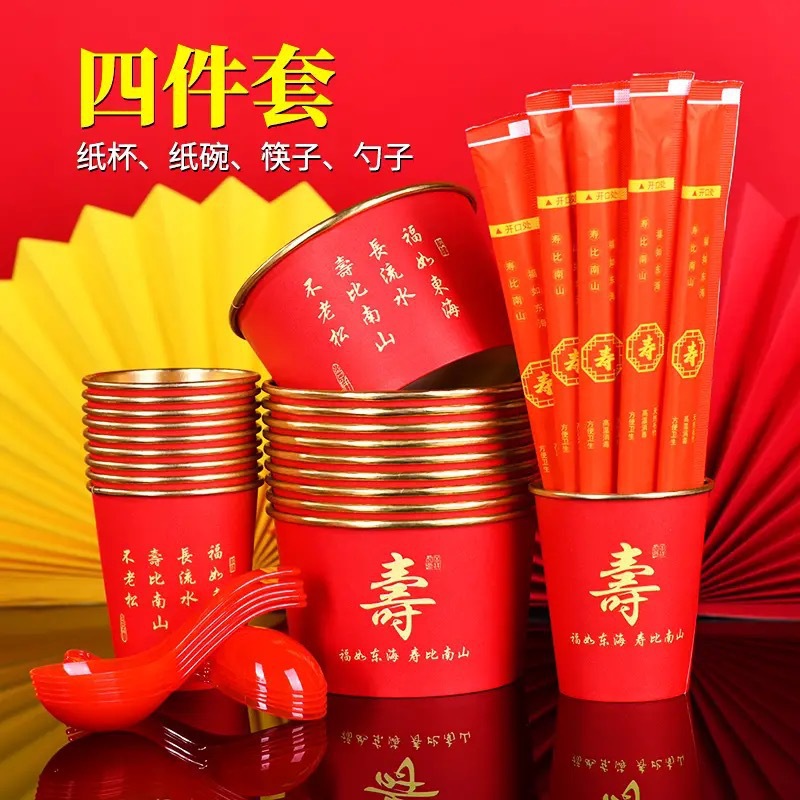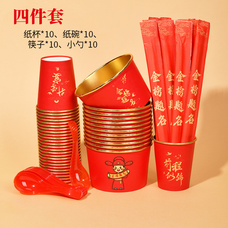 [four-piece gold foil set for birthday banquet] cup + bowl + chopsticks + spoon for 10 people