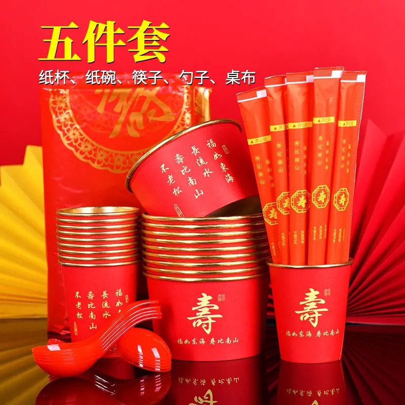 [five-piece set of gold foil for birthday banquet] cup + bowl + chopsticks + spoon + tablecloth for 10 people