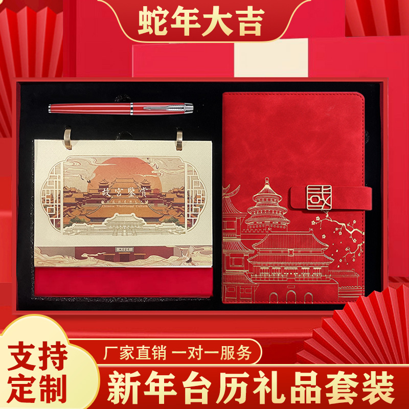 desk calendar set luxury five-piece set [leather desk calendar + leather chinese character buckle notebook + signature pen + gift box + gift bag]]