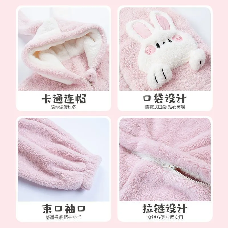 student one-piece pajamas coral fleece thickened warm hooded rabbit winter ins pajamas women can outerwear homewear