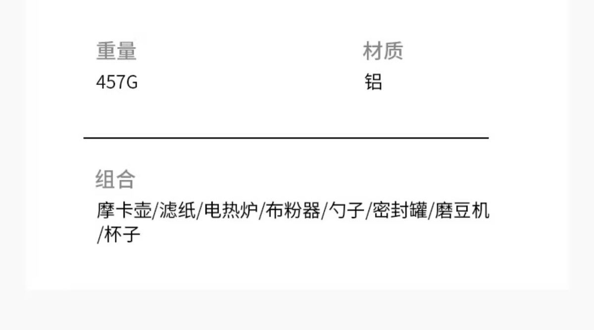 | moka pot + filter paper + coffee distributor + electrothermal furnace + sealed tank + bean spoon | CN¥ 246.78 | 99999 piece available |