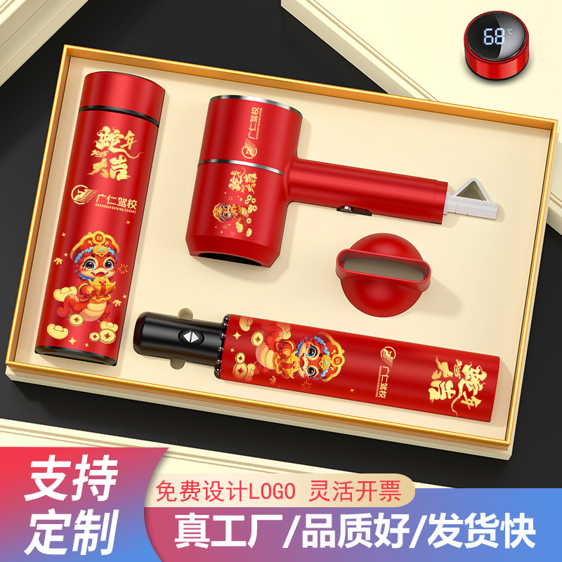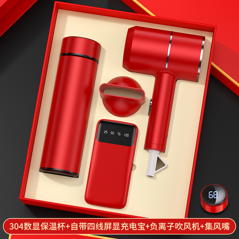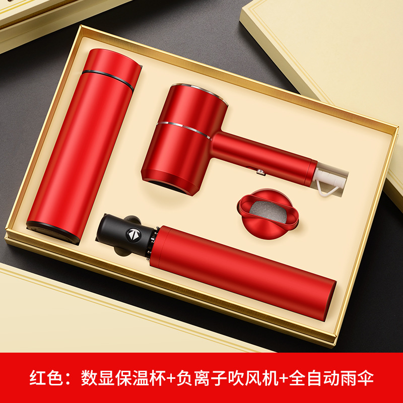 red digital display cup + hair dryer + automatic umbrella/gift box