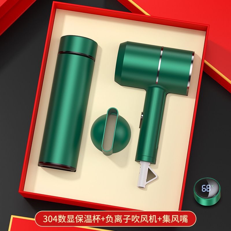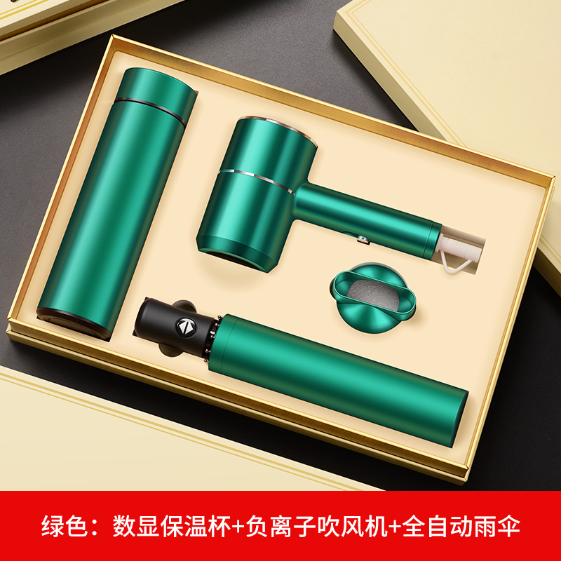 green digital display cup + hair dryer + automatic umbrella/gift box