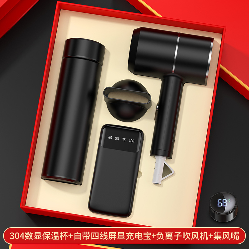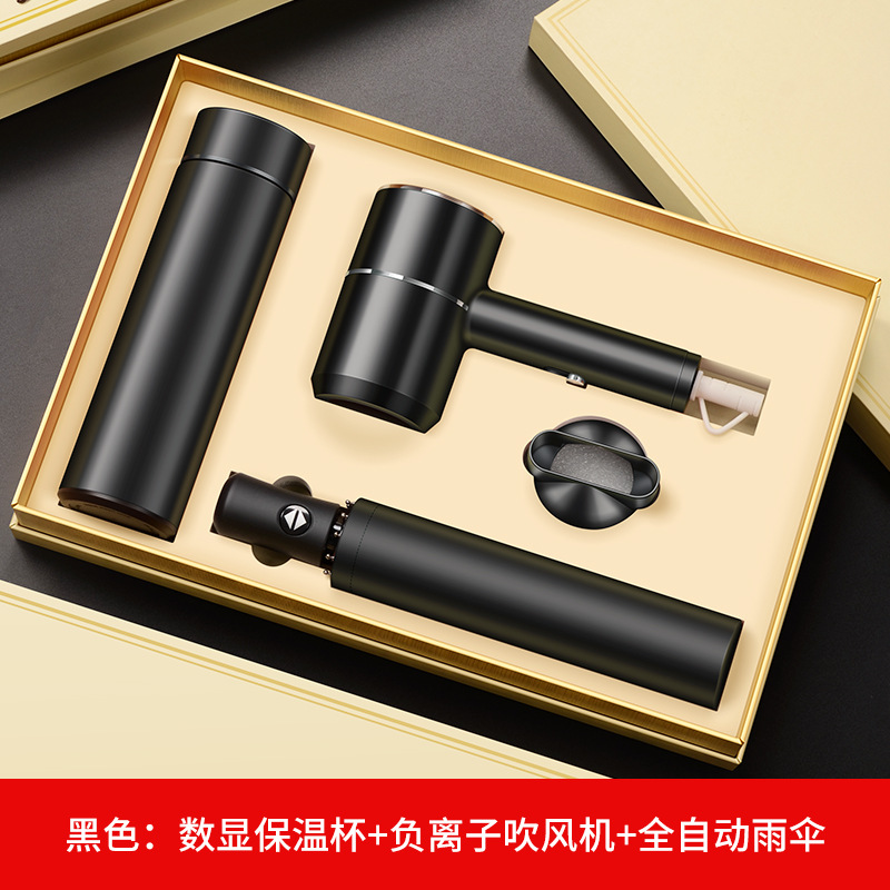 black digital display cup + hair dryer + automatic umbrella/gift box