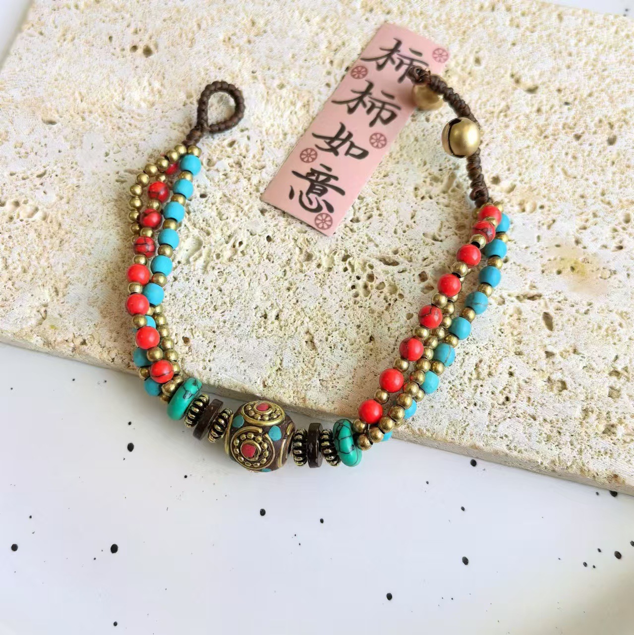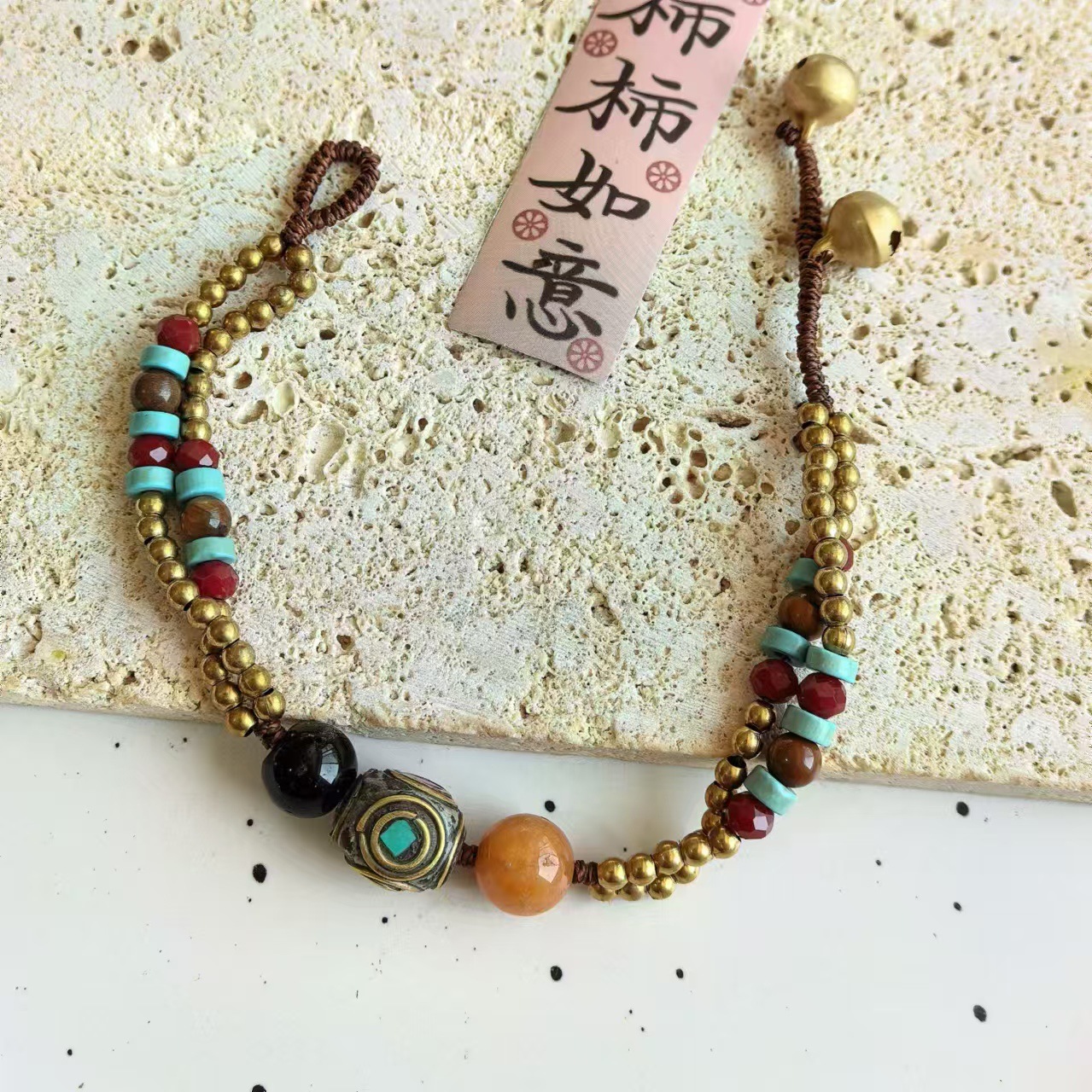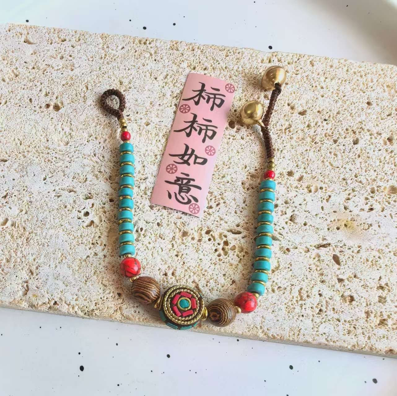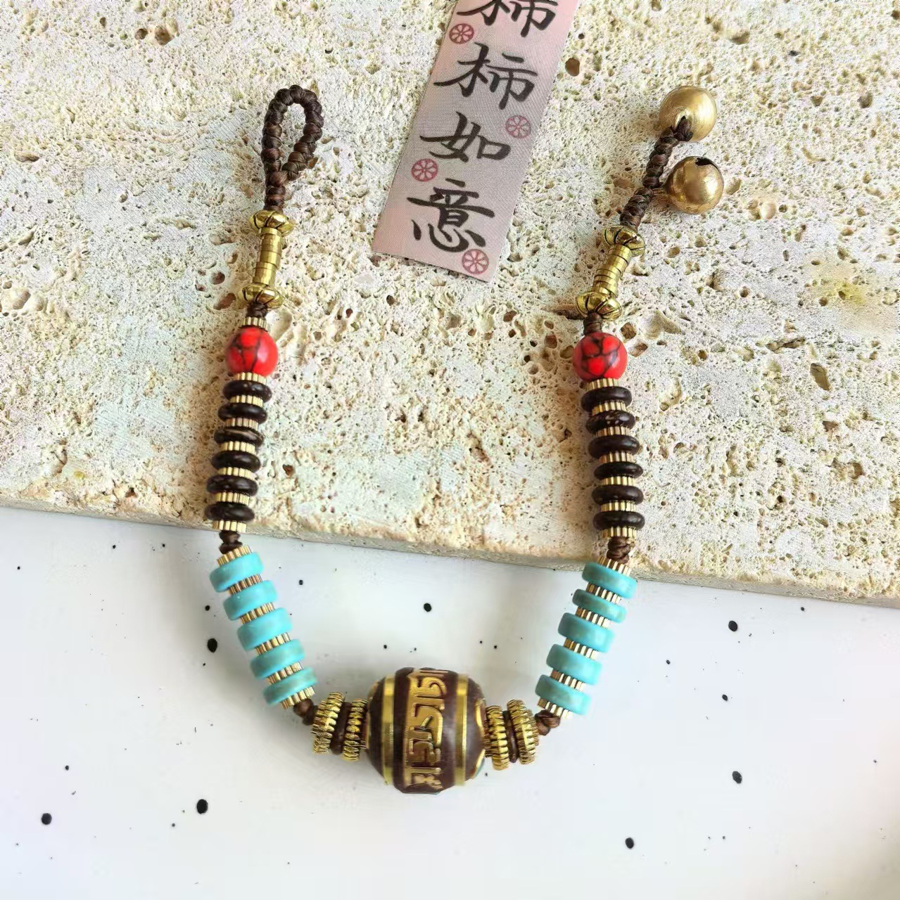 Material: Nepalese handcrafted copper beads, turquoise, copper beads, alloy, Thai wax thread, copper bells, natural stones.