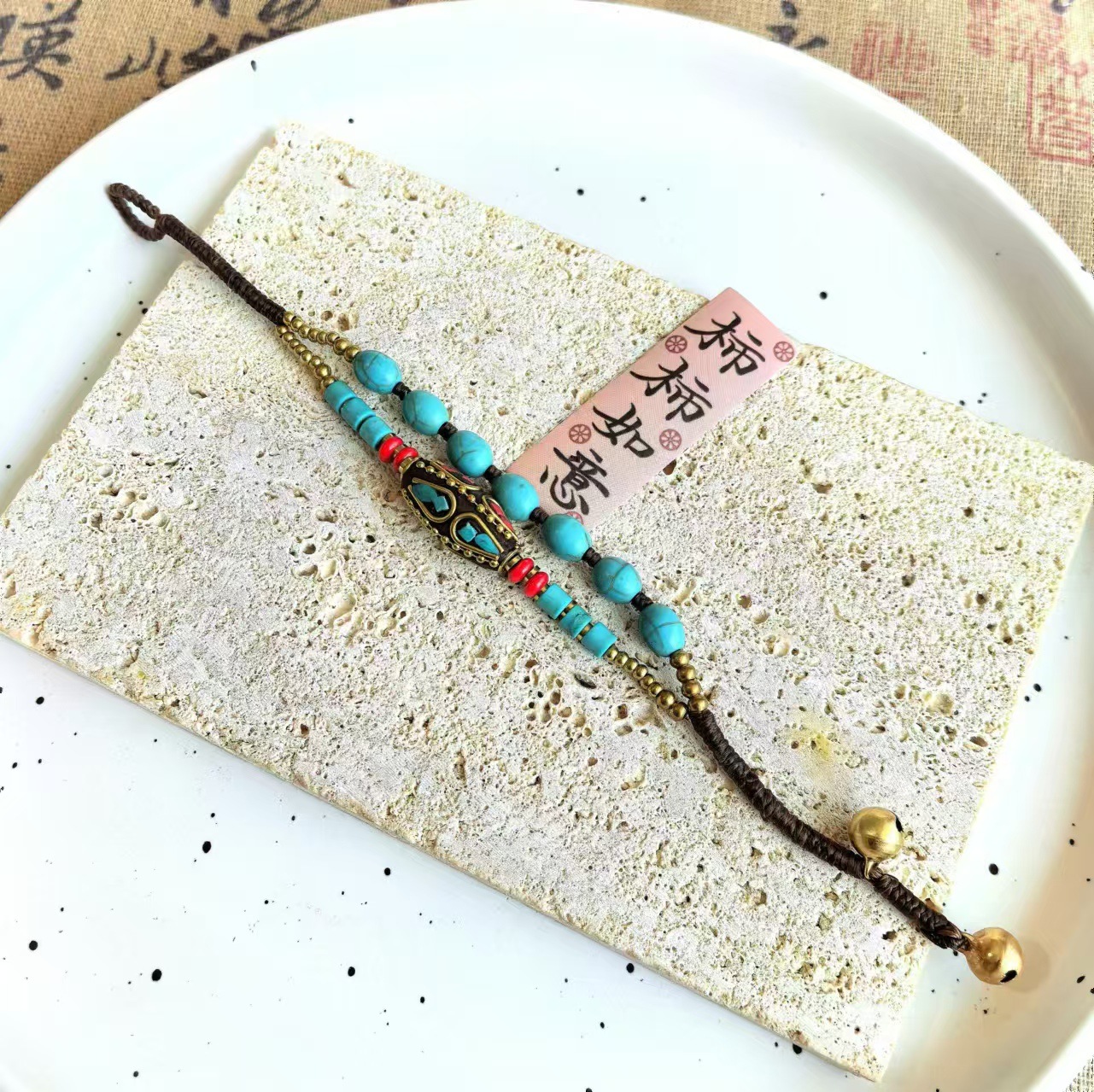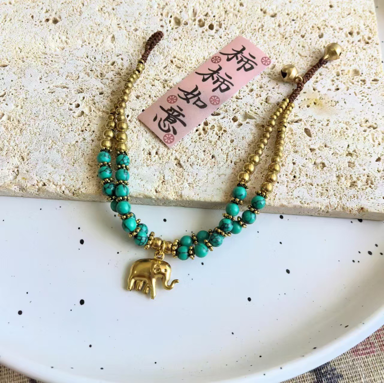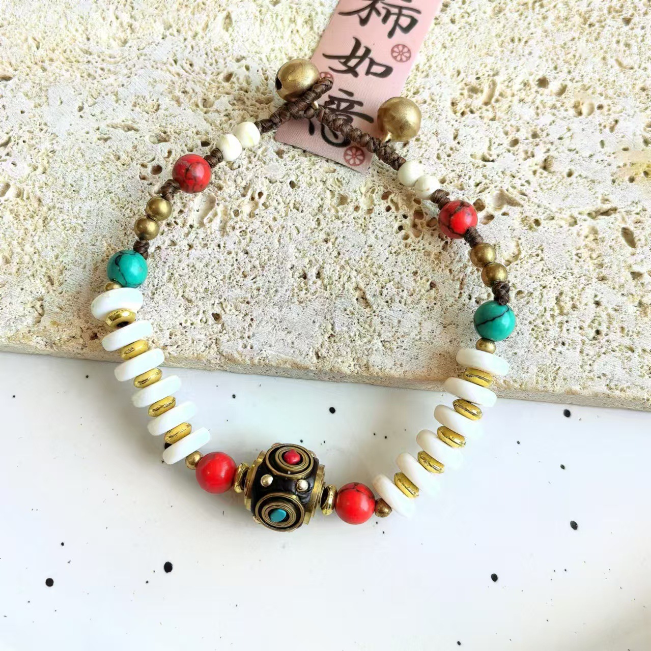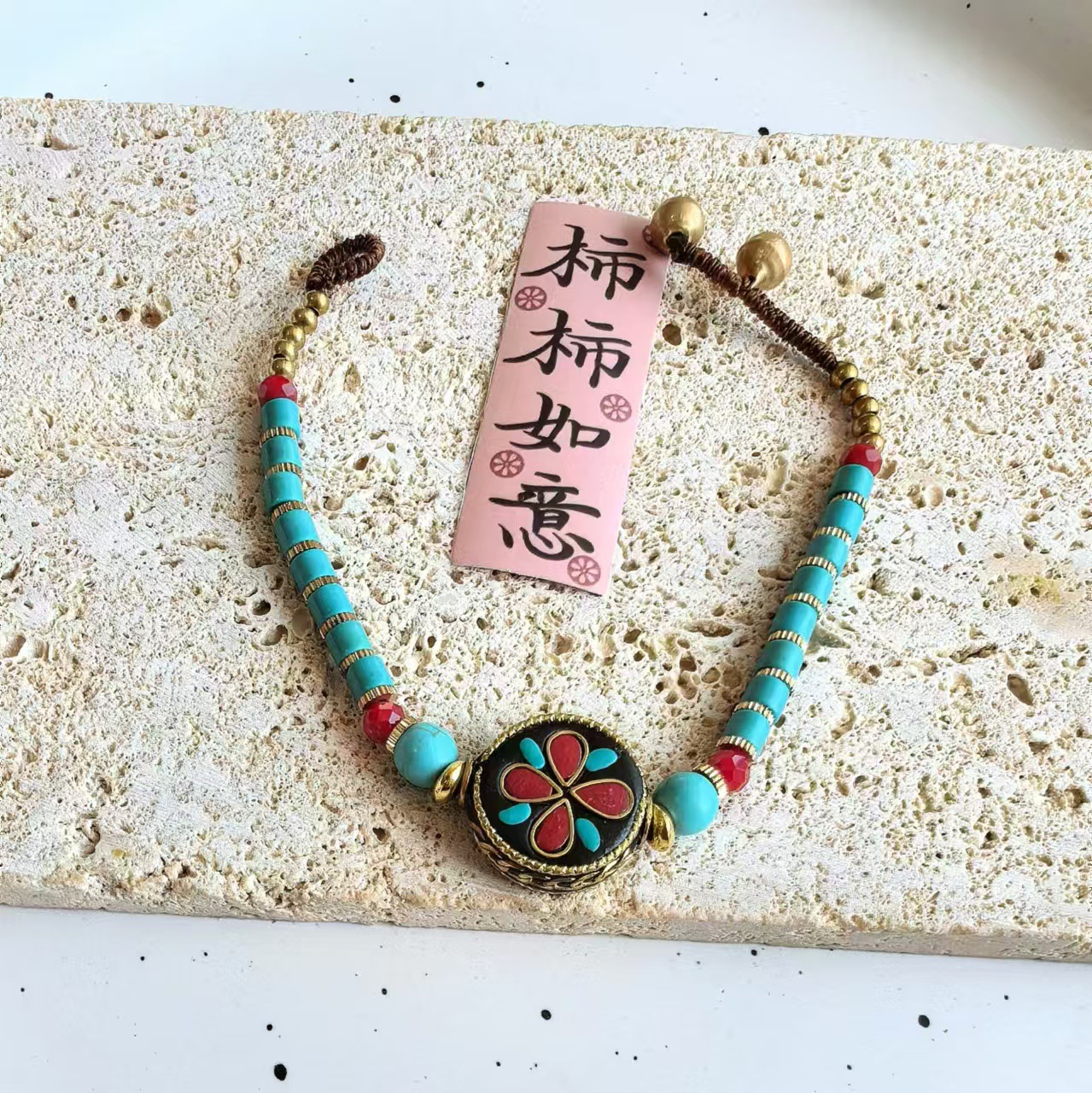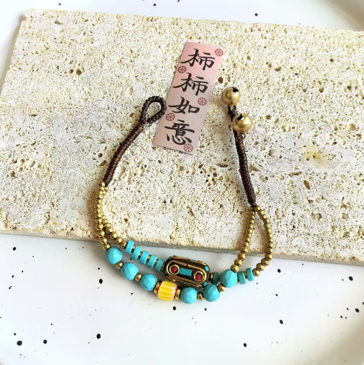 Material: Nepalese handcrafted copper beads, turquoise, copper beads, alloy, Thai wax thread, copper bells, natural stones.