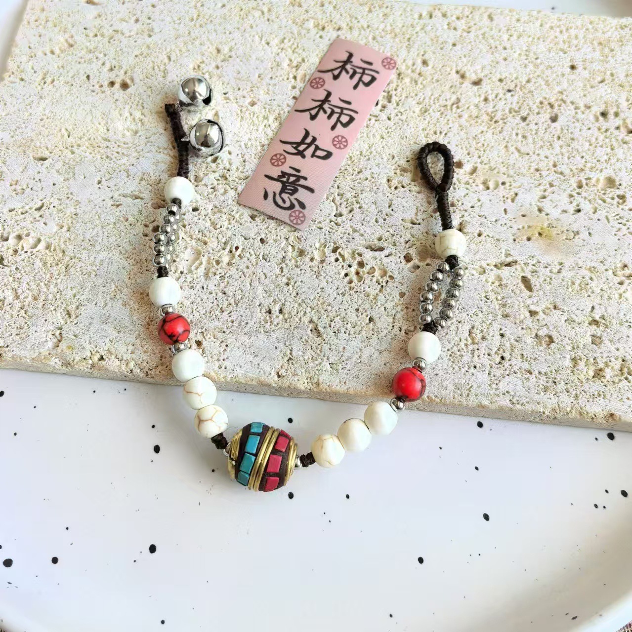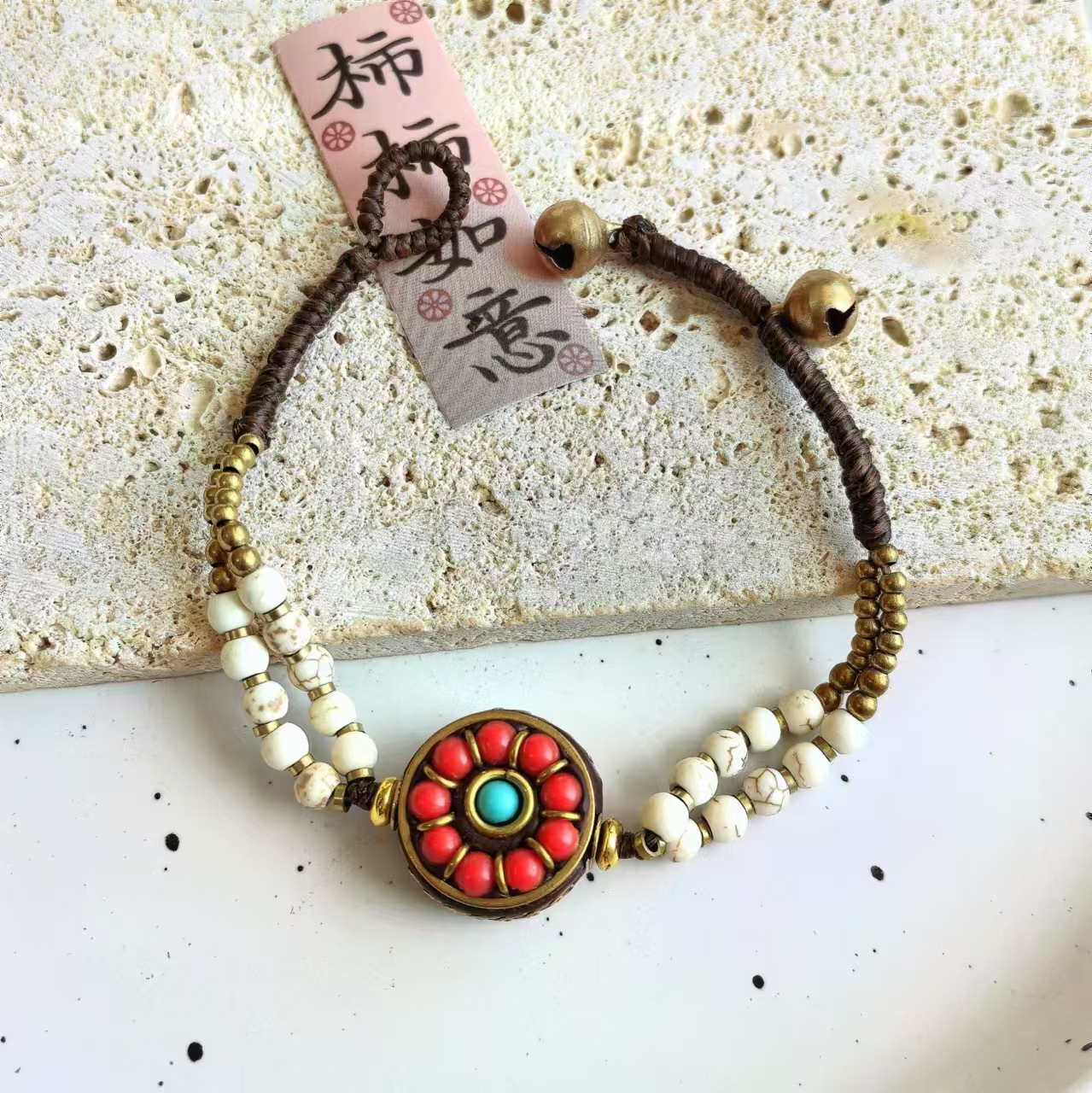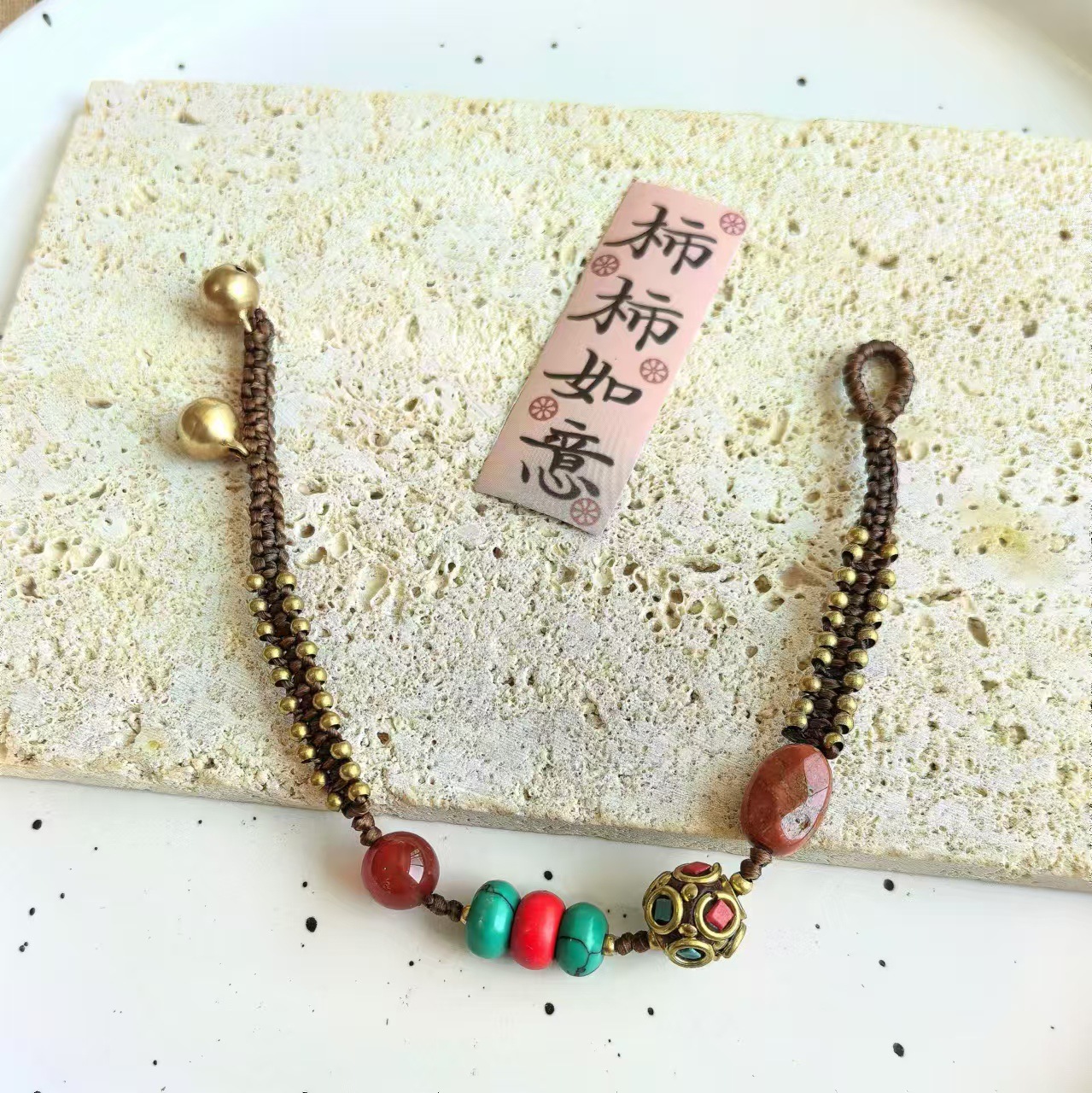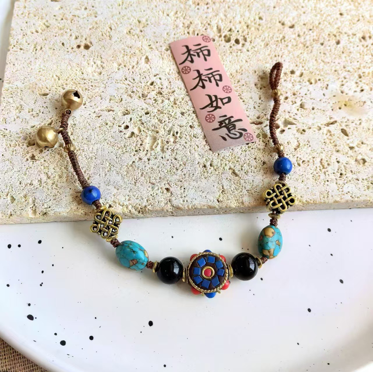 Material: Nepalese handcrafted copper beads, turquoise, copper beads, alloy, Thai wax thread, copper bells, natural stones.