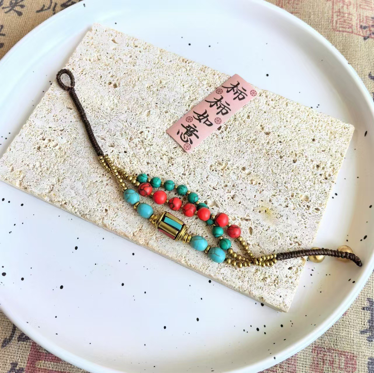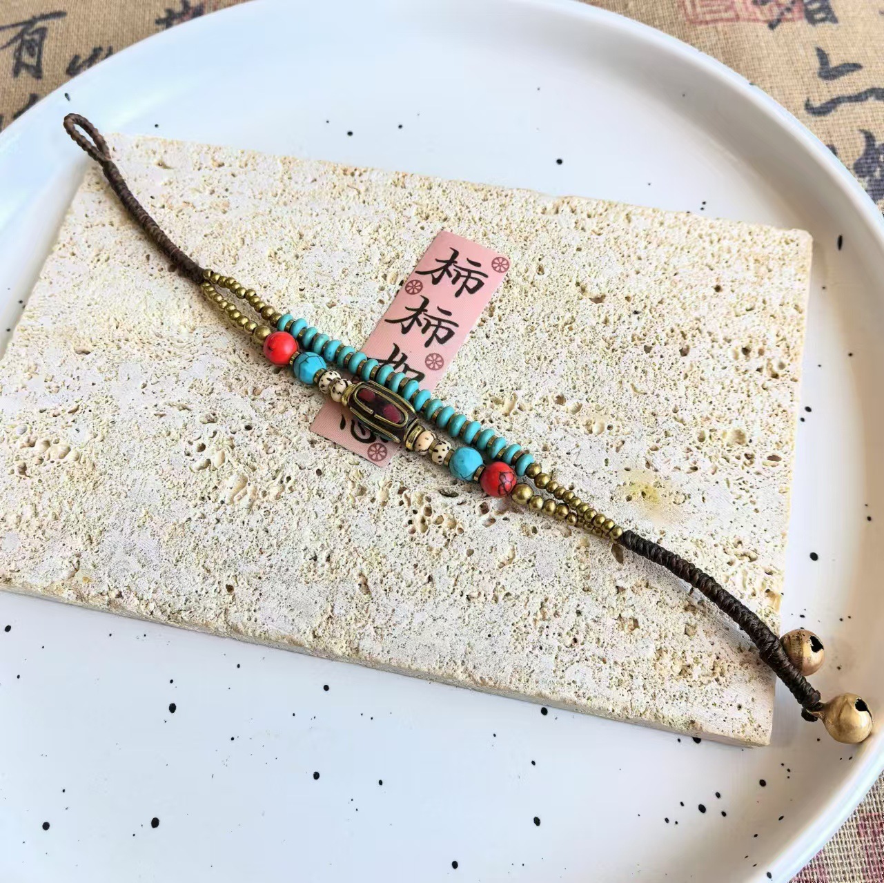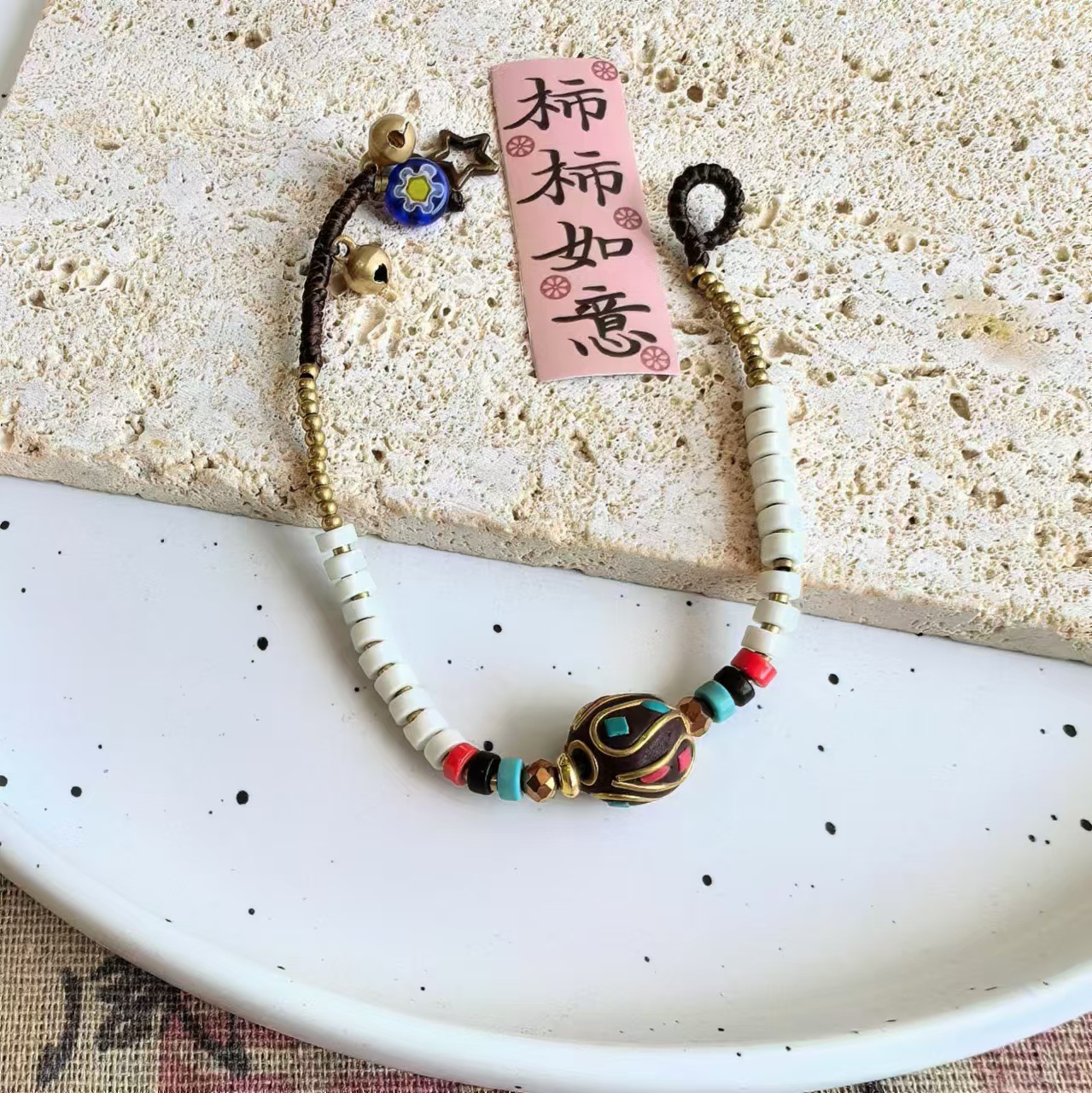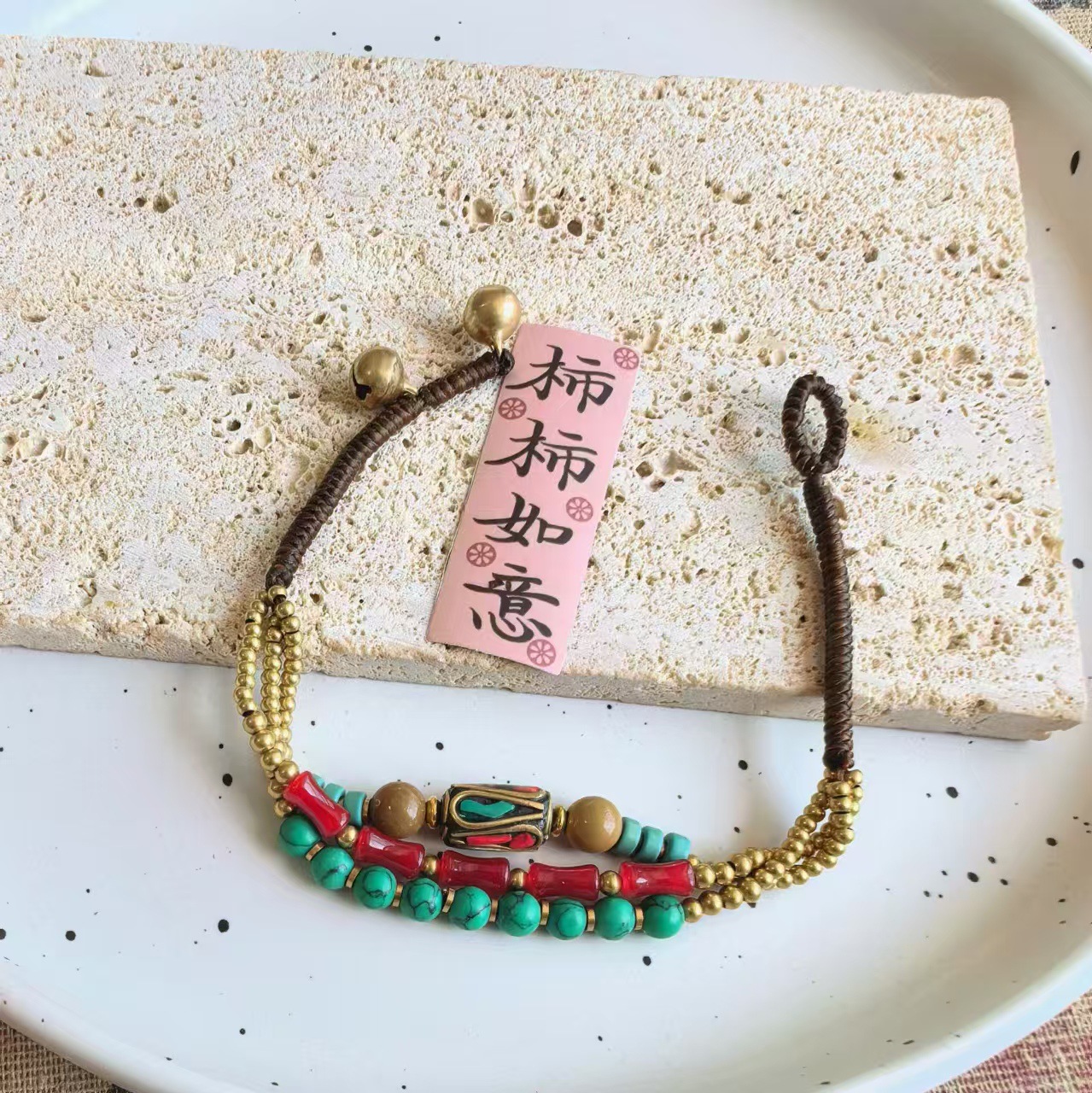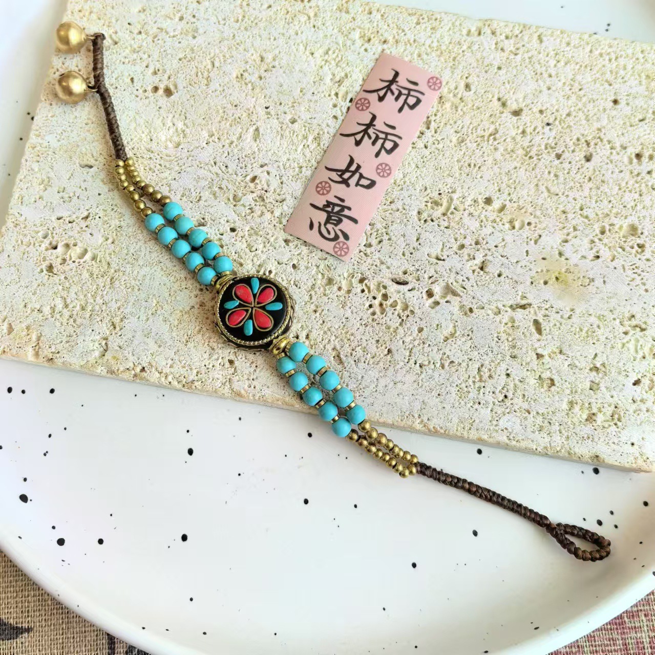 Material: Nepalese handcrafted copper beads, turquoise, copper beads, alloy, Thai wax thread, copper bells, natural stones.
