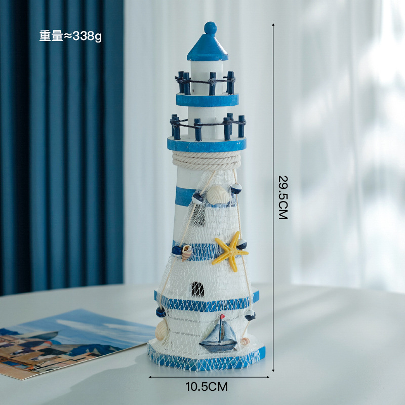 This lighthouse is crafted entirely from solid wood. Below the lighthouse are various Mediterranean-style decorations, such as tree stumps, seagulls, and oars. The tower is wrapped with fishing nets and rope, with small fish hanging from it, making it an essential element of Mediterranean home decor. The lighthouse has been weathered to give a worn look, with the wood grain showing through. Please be cautious when purchasing, as the item may not be as you expect.