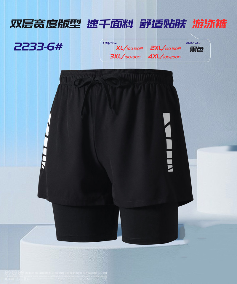 Double-layer anti-embarrassment men's adult swimsuit, dry-fit fabric. Available in four sizes.