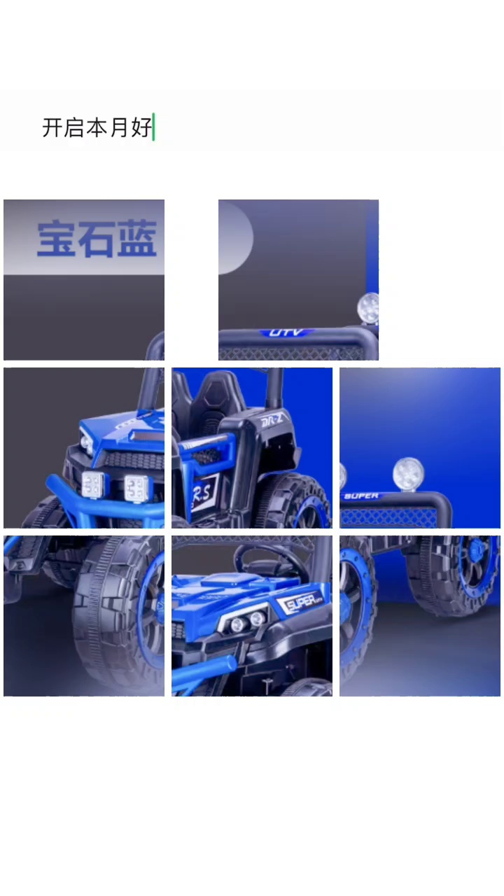 One-click Start. 2.4g one-to-one Bluetooth remote control. Swing function. Bluetooth music version. Four-wheel shock absorber. Convenient handle