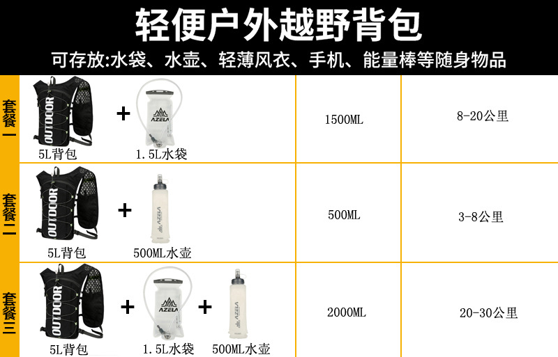 | single pack + 500ml kettle + 1500ml blue water bag | ¥60.0 | 3266 piece available |