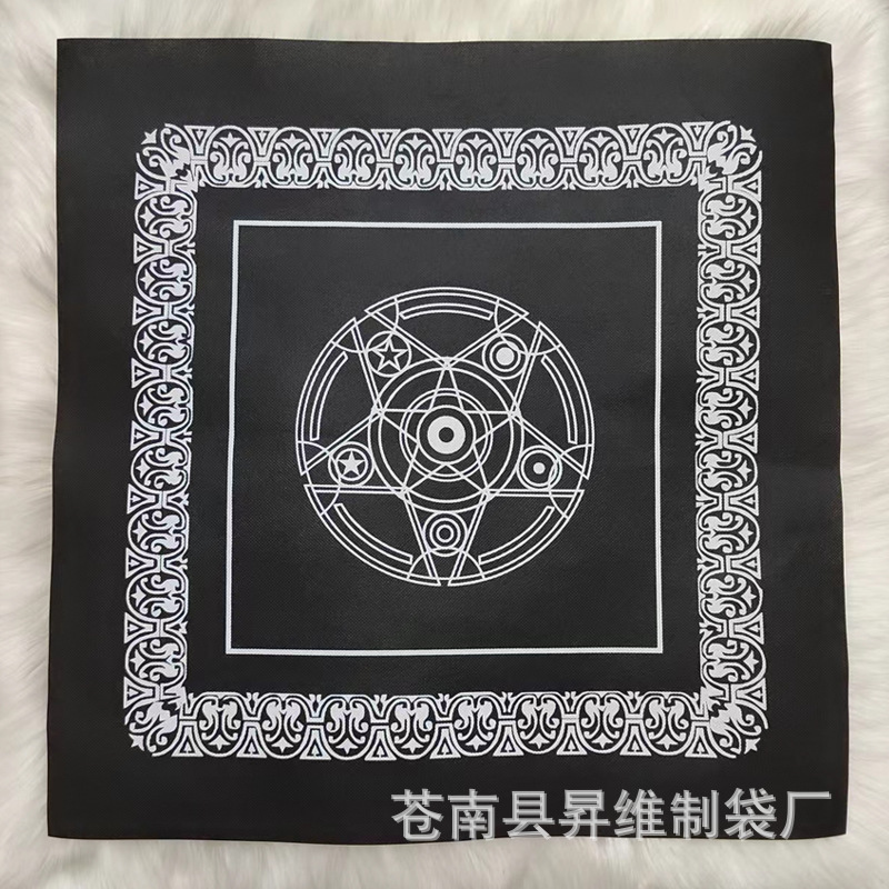 In-stock velvet tablecloths are made of velveteen material with screen printing technology. They feature pentagram and octagram patterns. The specifications are 50cm*50cm (some color options may be 49*49cm). The velvet bag specifications are 11.5*18cm. If you need to customize other sizes or logos, please contact customer service. We can customize various sizes and colors, and logos can be screen printed or embroidered.