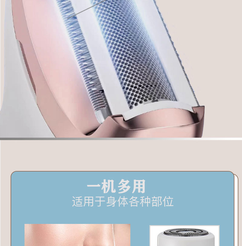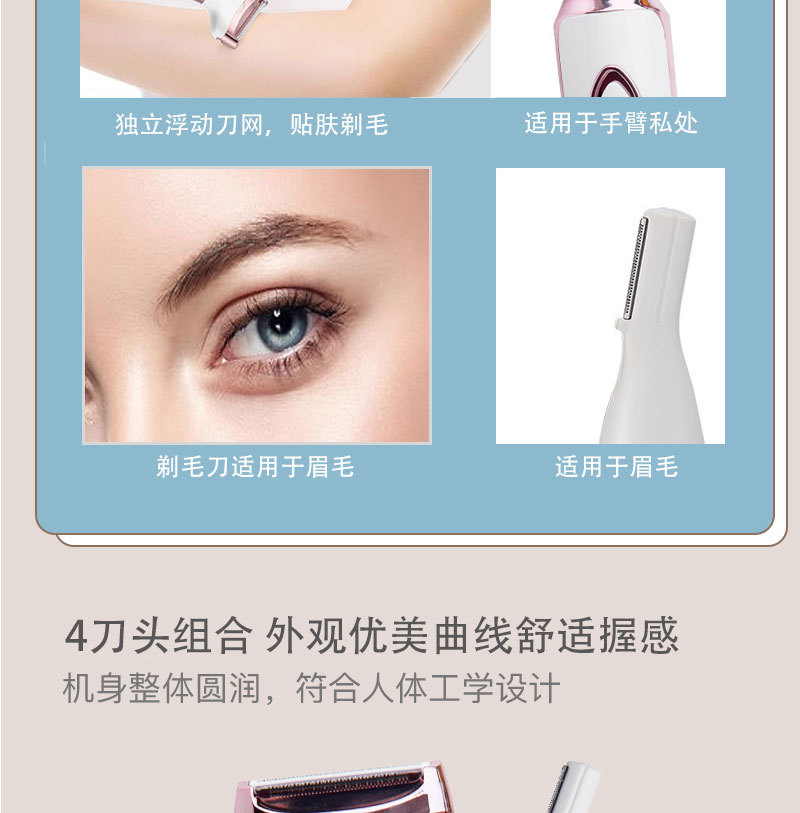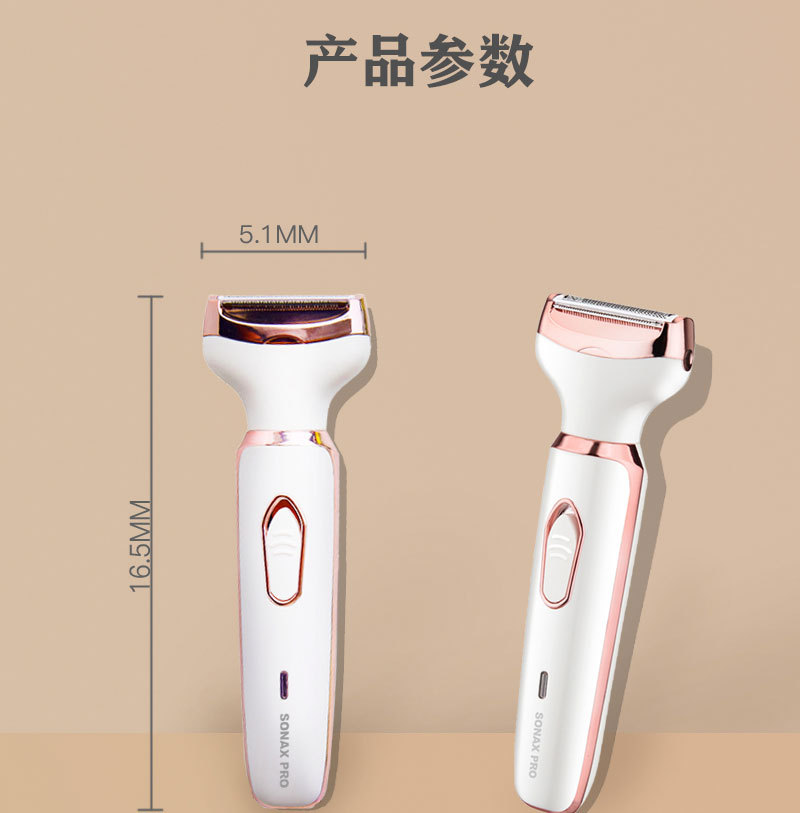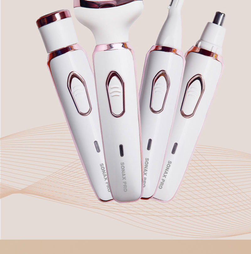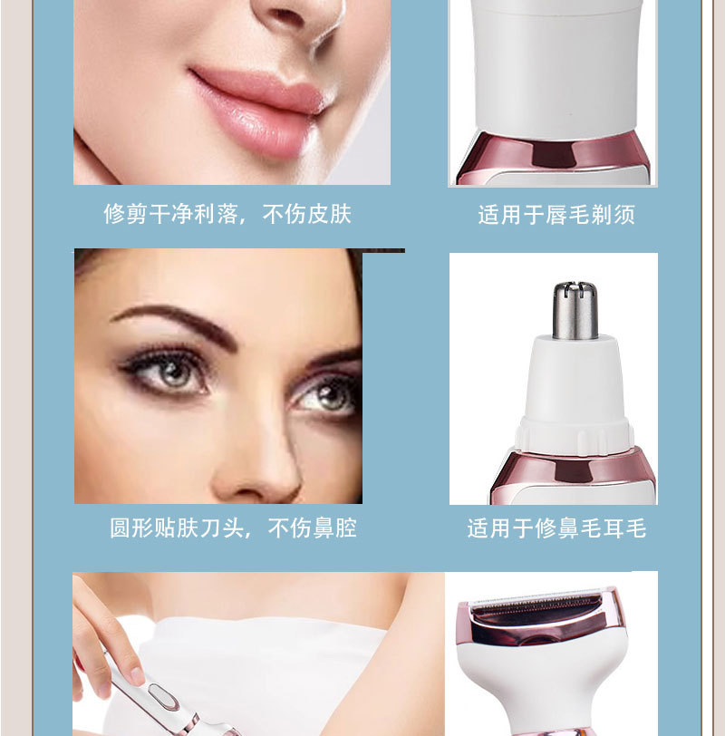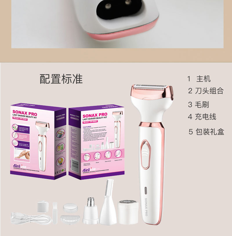 The set includes: 1 x shaver body, 1 x razor blade, 1 x nose hair trimmer, 1 x eyebrow trimming blade, 1 x cleaning brush, 1 x USB charging cable, and 1 x English user manual.