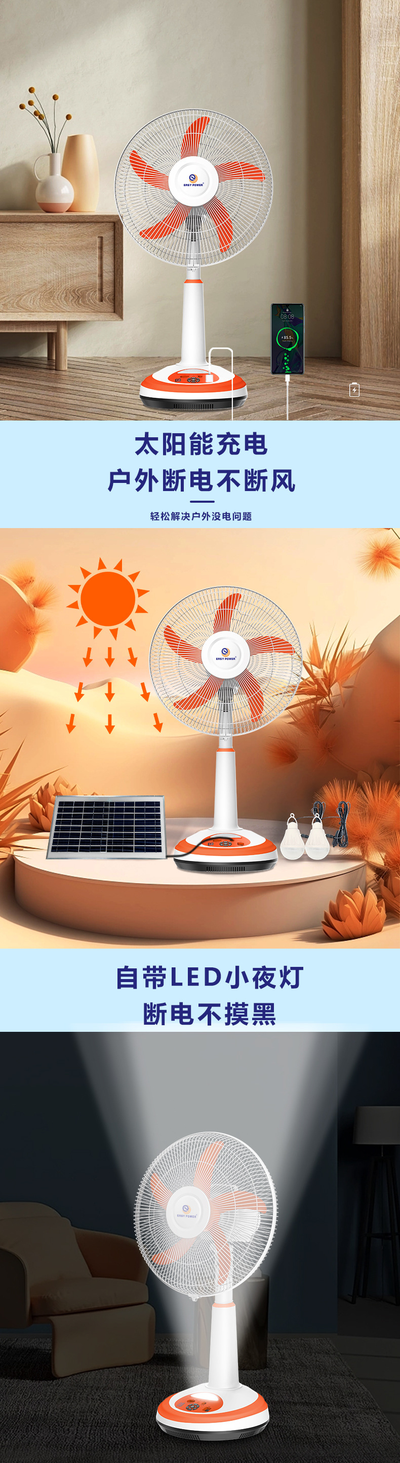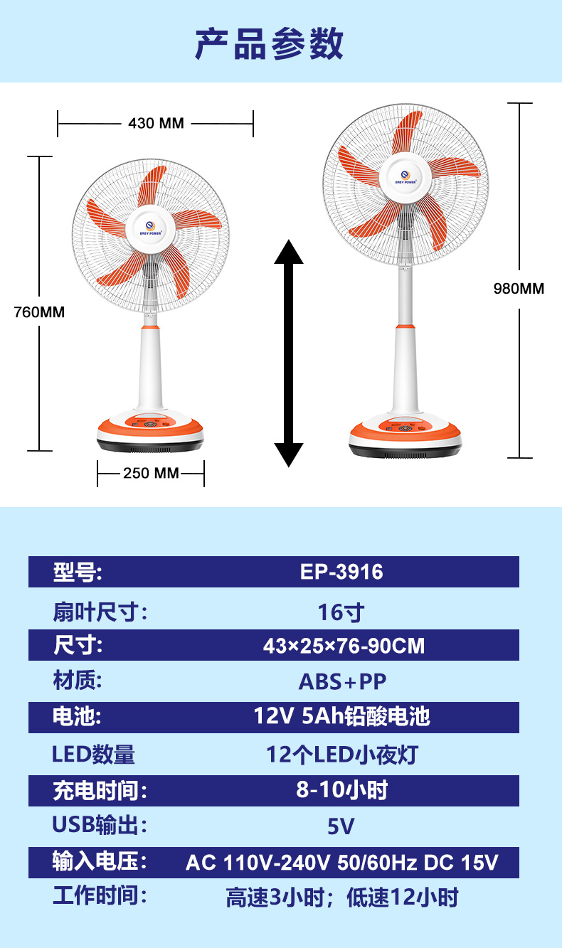 foreign trade dedicated solar fan ac/dc rechargeable lifting adjusting belt lighting function 16-inch fan