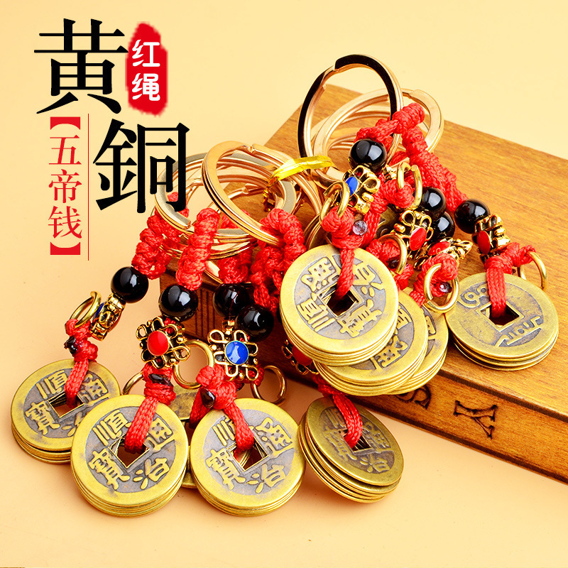 red rope qing dynasty five emperors' coins keychain (brass)