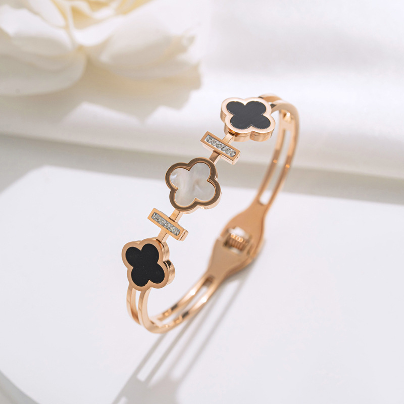rose gold black wide diamond clover bracelet