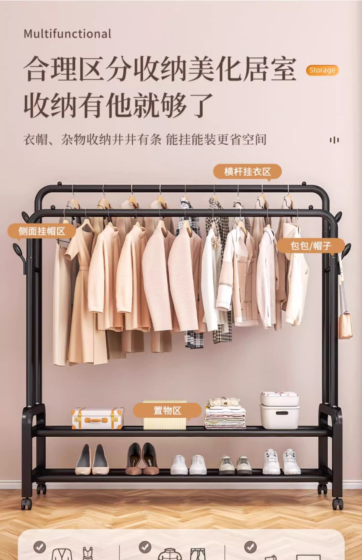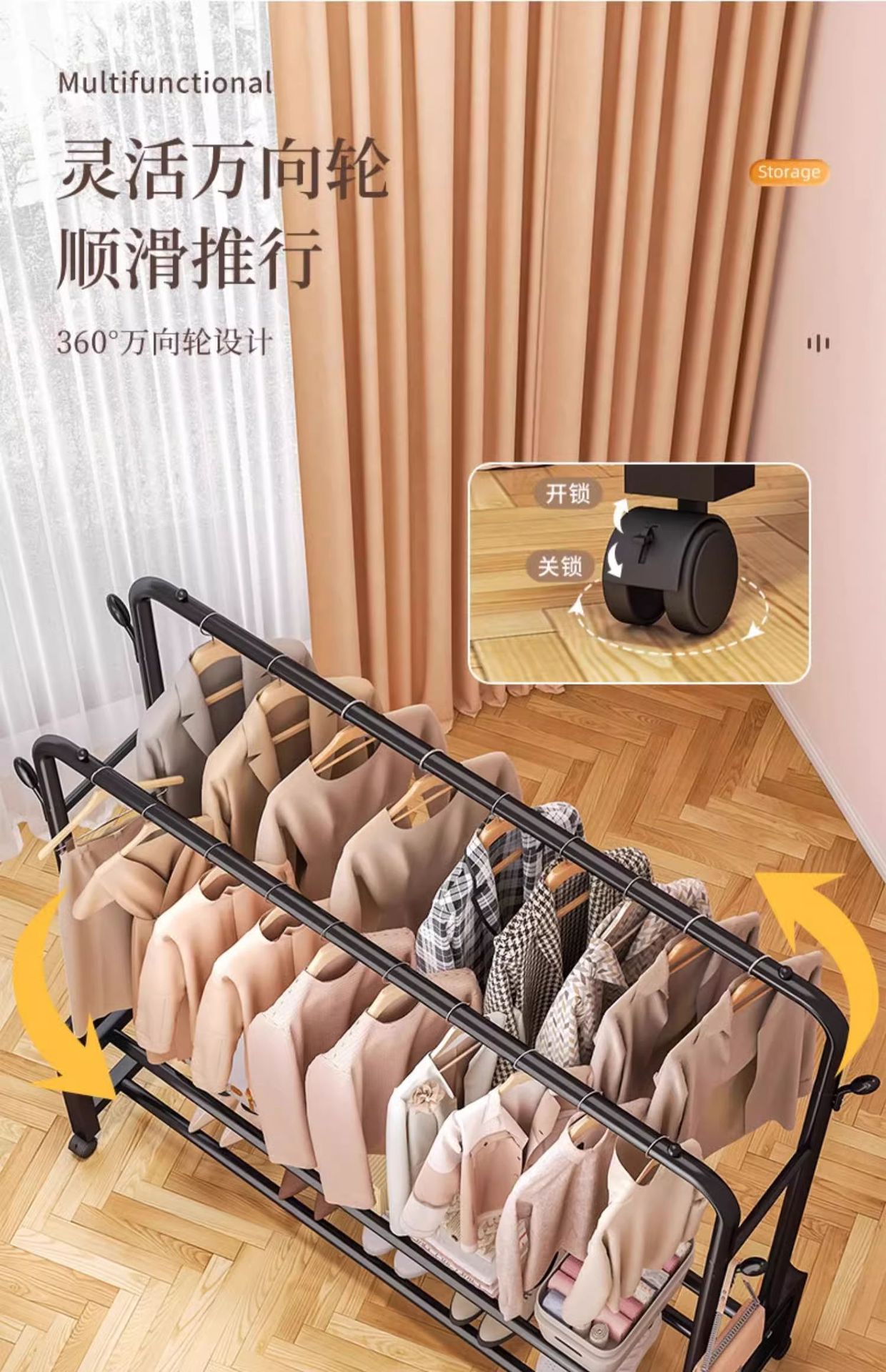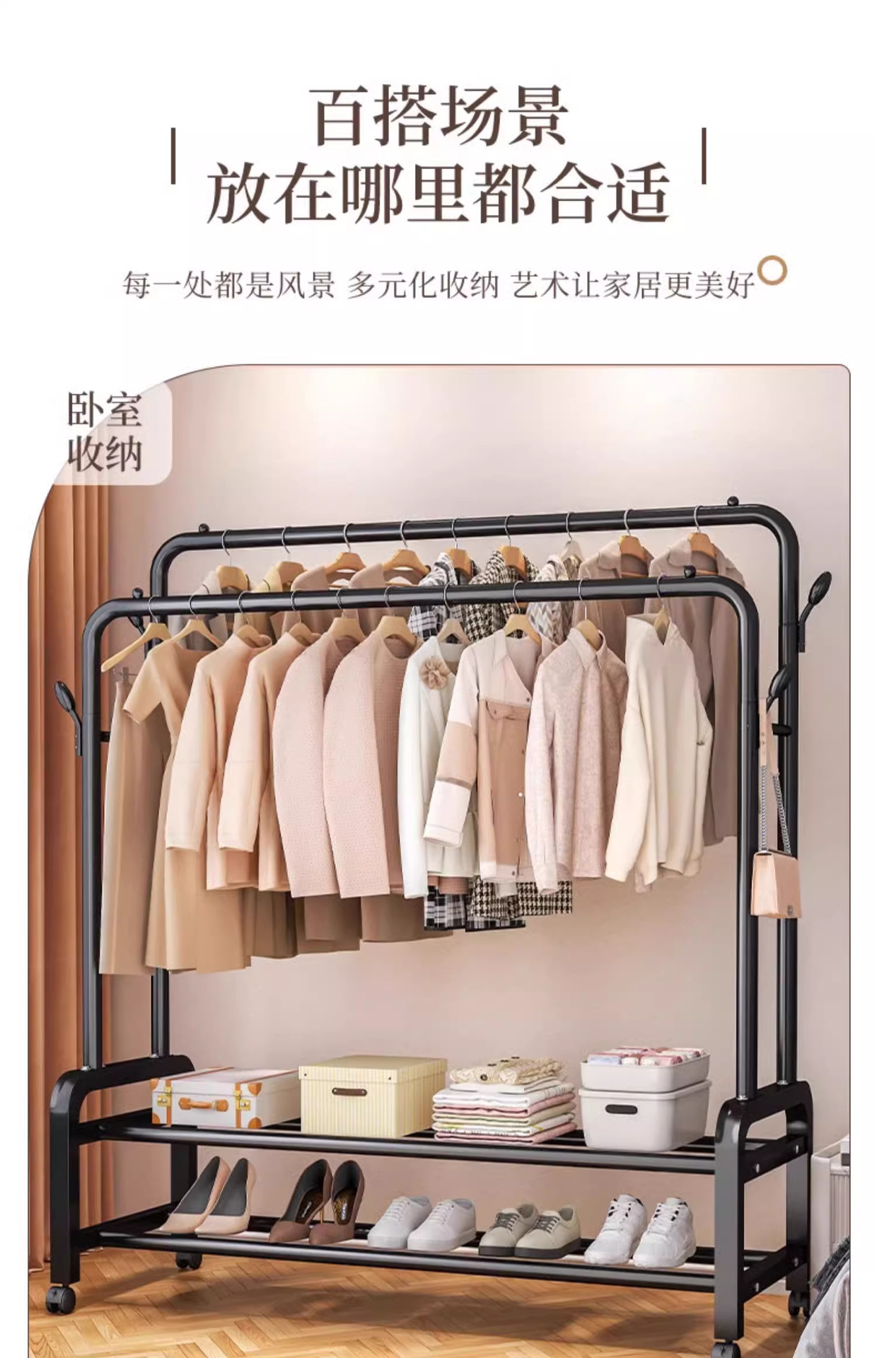[double rod double layer 150 black]-four hooks + universal wheel special thick type