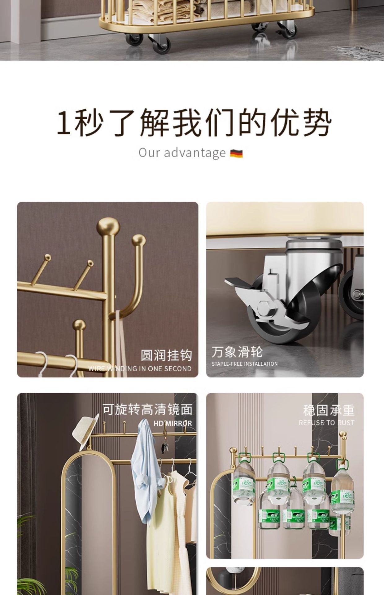 thickened small size light luxury gold 60cm [rotatable mirror-4 hooks storage large mesh basket-universal wheel]]