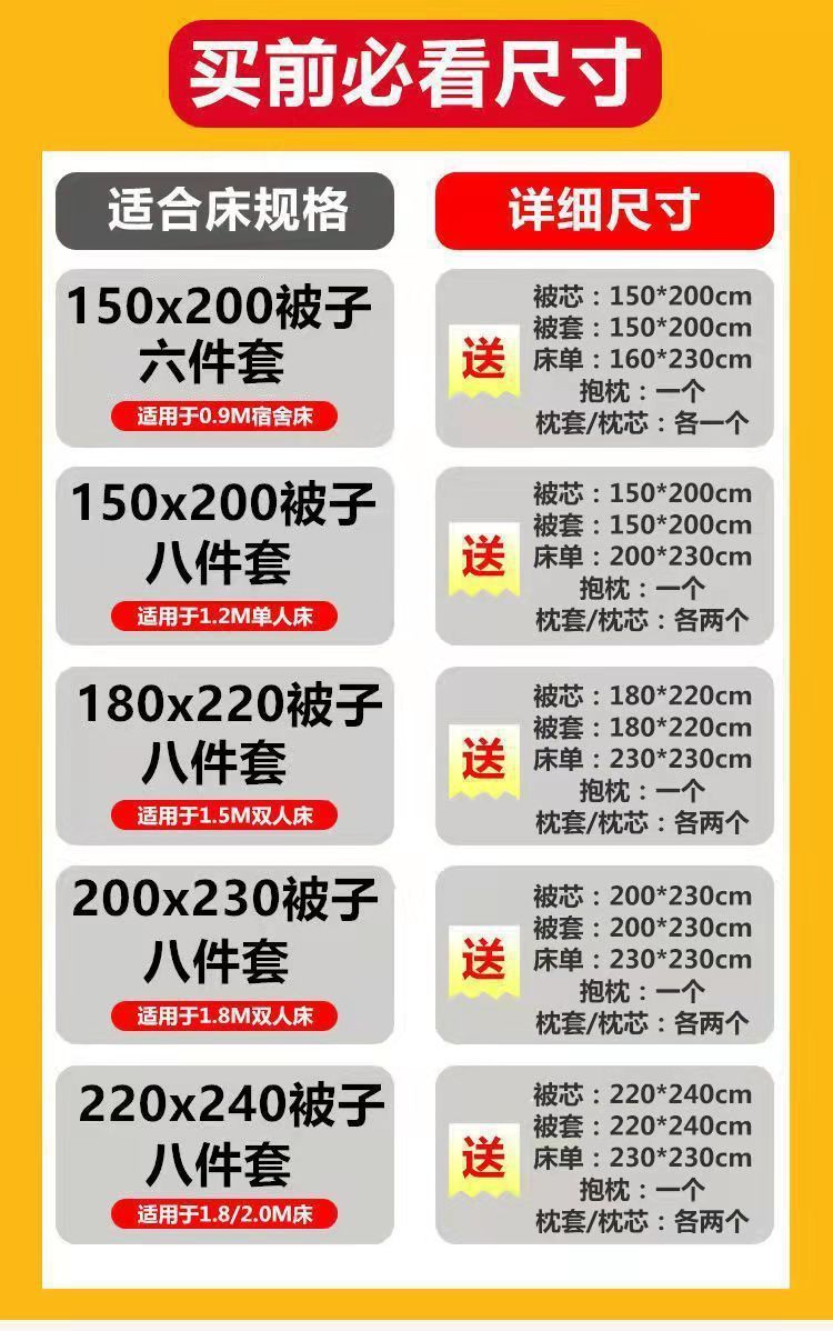 | 1.5m bed eight-piece set (bed sheet + quilt cover +2 pillowcase +1.50kg quilt +2 pillow core + pillow) | CN¥ 100.0 | 42298 piece available |
