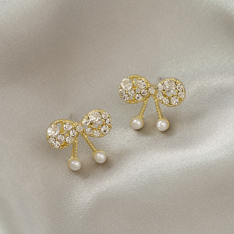 25# bow rhinestone pearl stud earrings