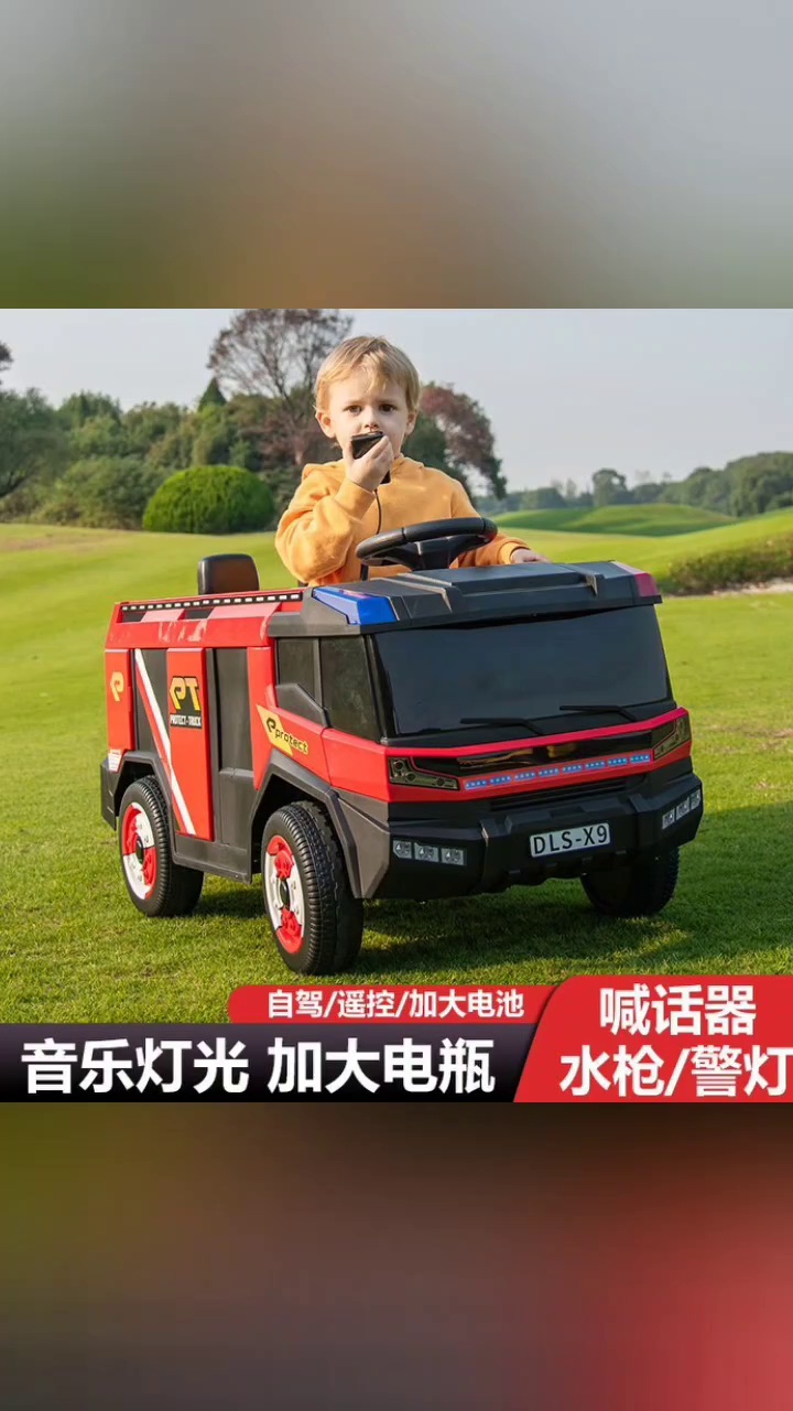 Children's fire truck, storage tank, lengthened water gun. Shovel. LED colorful alarm light light subwoofer. Multifunctional music player USB jack/MP3 Jack megaphone, siren. Smart soft start,. Four-wheel shock absorption. Wheels with PVC silent wheel