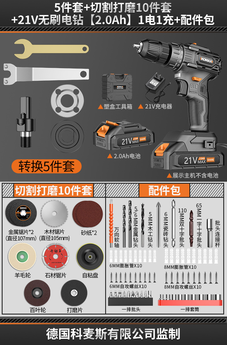5-piece set +10-piece cutting and polishing set +21v brushless electric drill [2.0ah] 1 power 1 charge + configuration