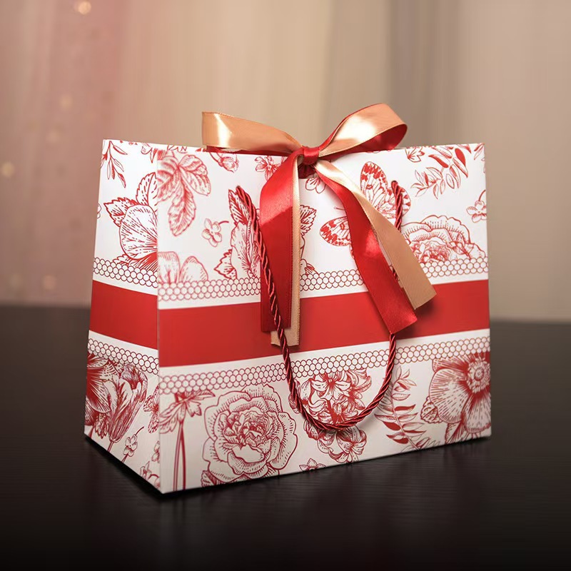 no words red and white flowers (gold red ribbon); small size 18*16*10; white card