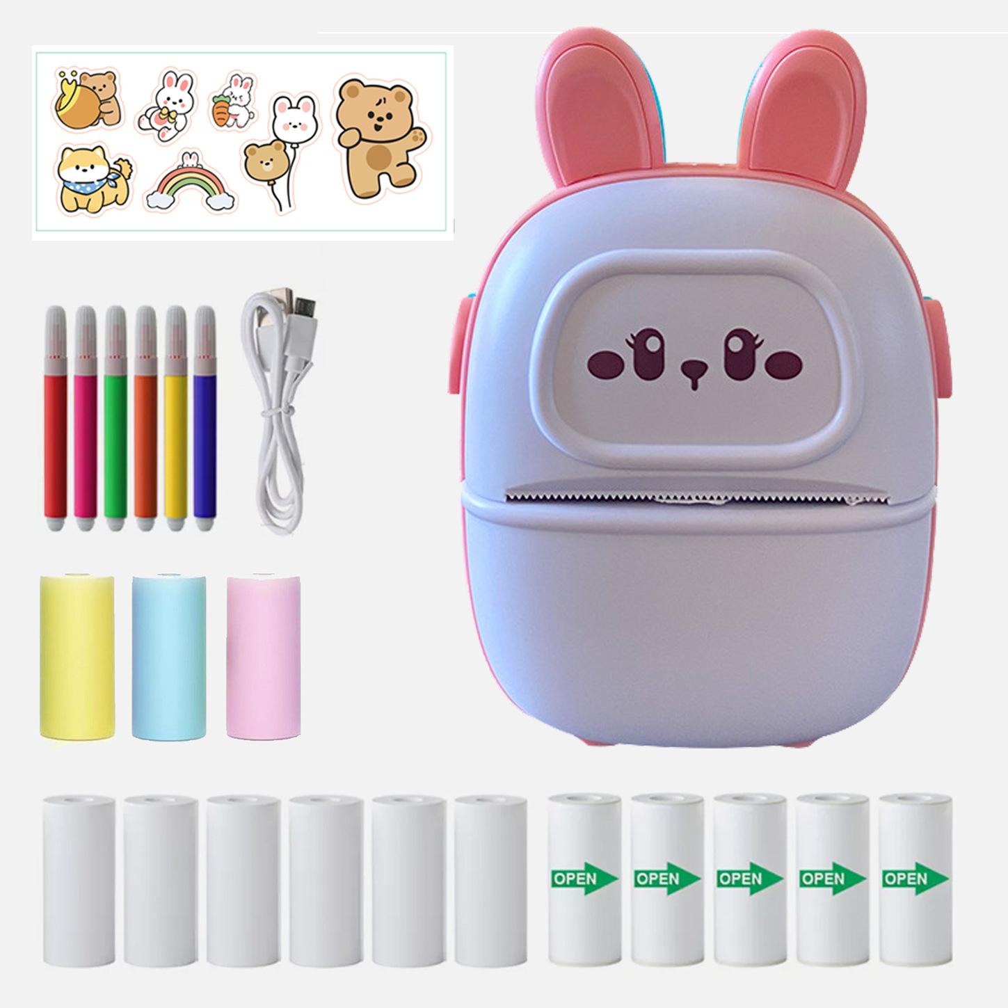 d2 pink +6 rolls printing paper +5 stickers +3 rolls fancy paper +6 pens + stickers + buggy bag