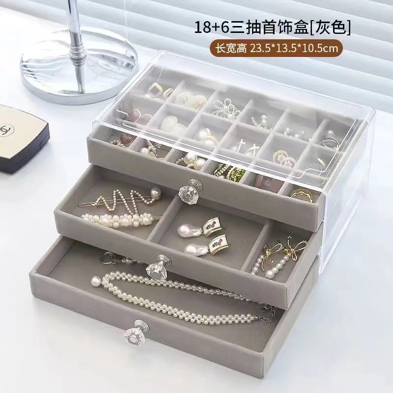 silver gray three-layer jewelry box (18 grid +6 grid + empty plate)