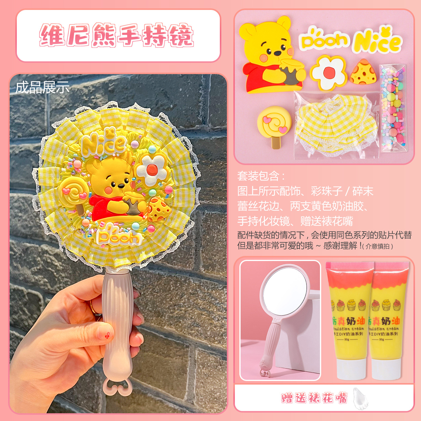 [card bag packaging] pink handheld mirror + pooh bear material package + gift decorating nozzle