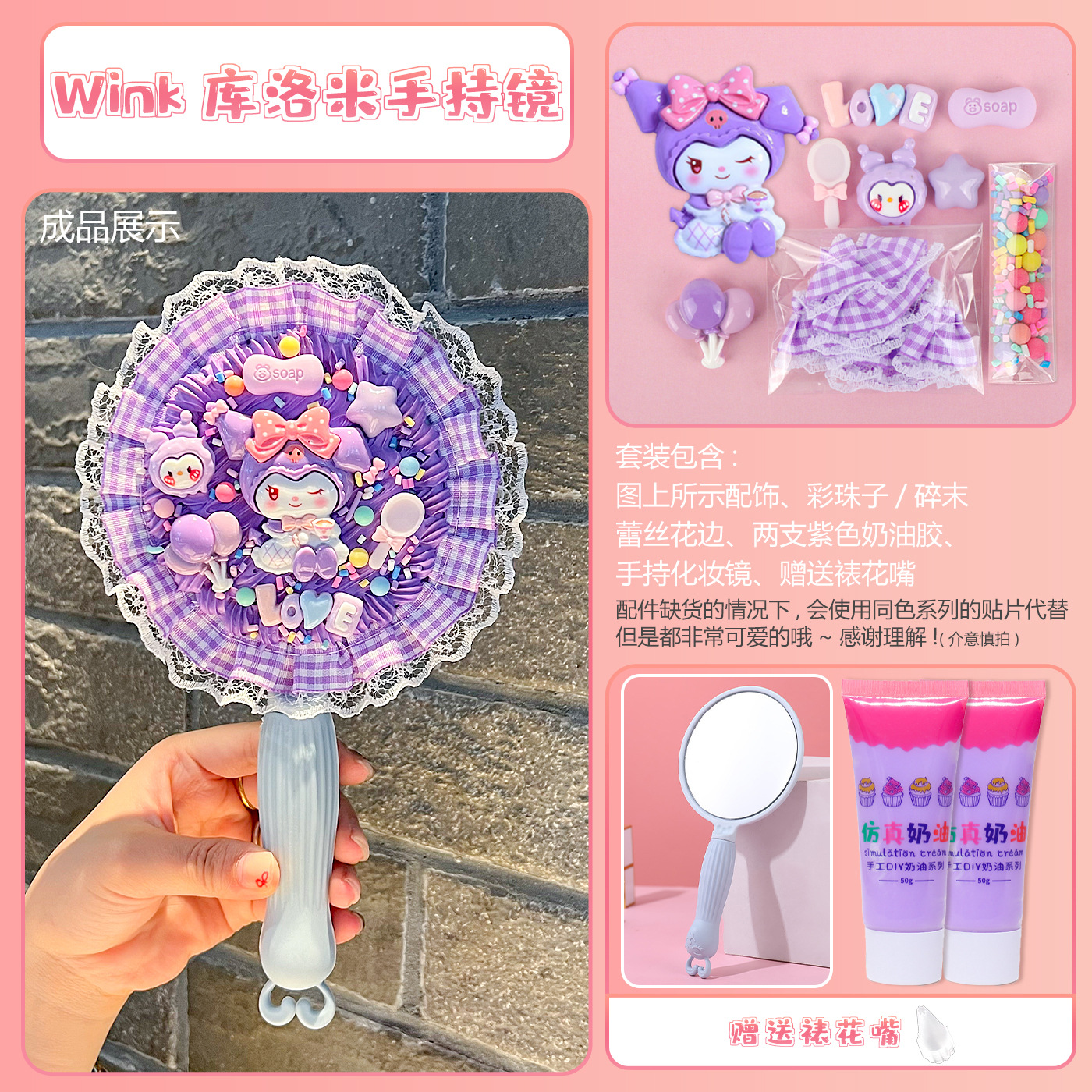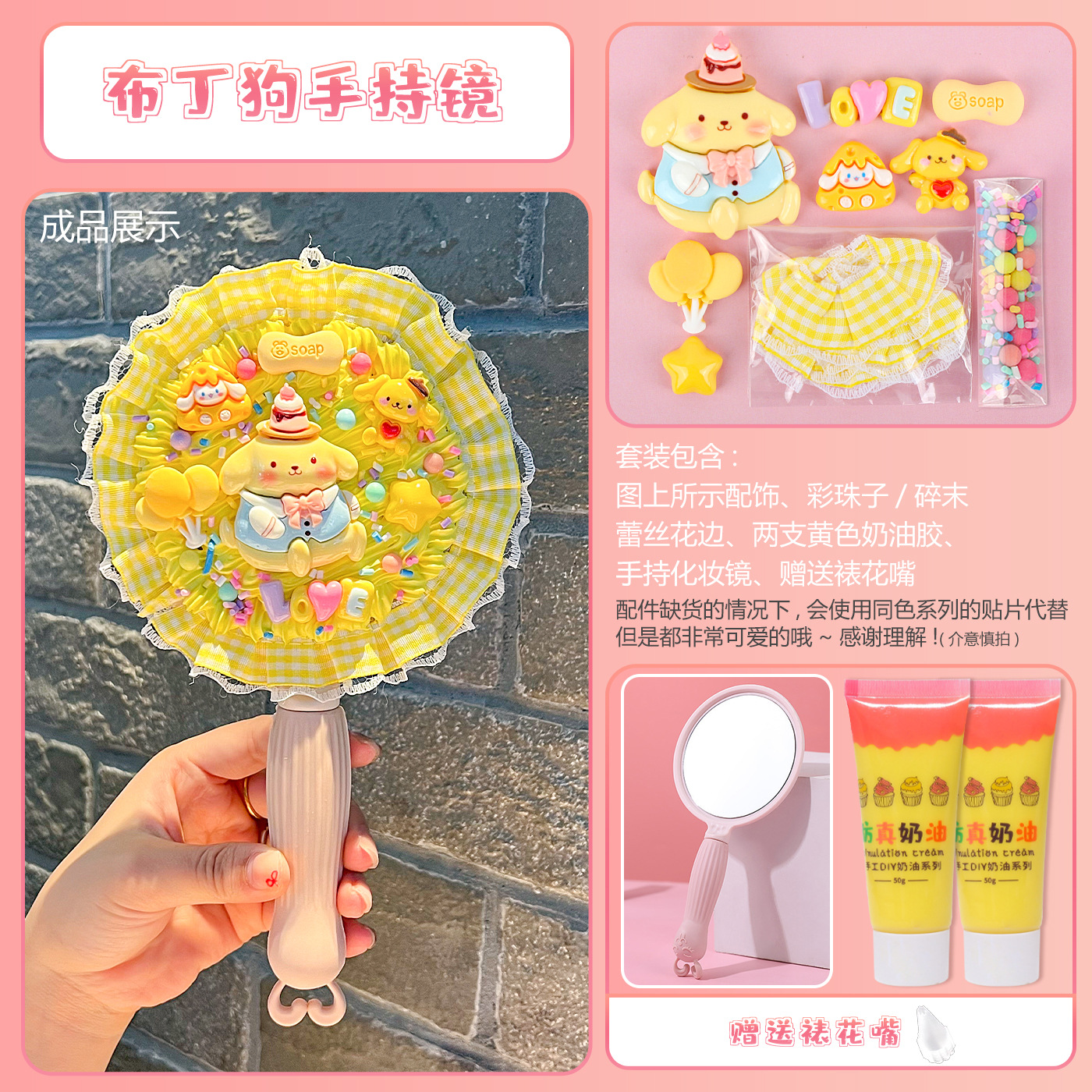 [card bag packaging] pink handheld mirror + pom pom purin material package + free decorating nozzle
