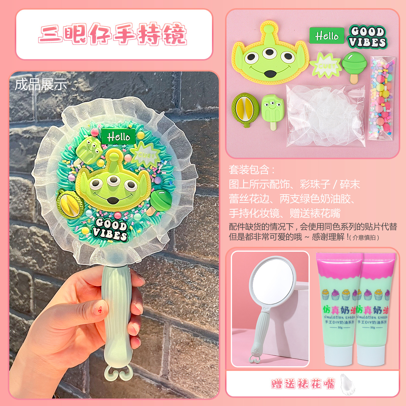 [card bag packaging] light green handheld mirror + three-eyed alien material package + free decorating nozzle