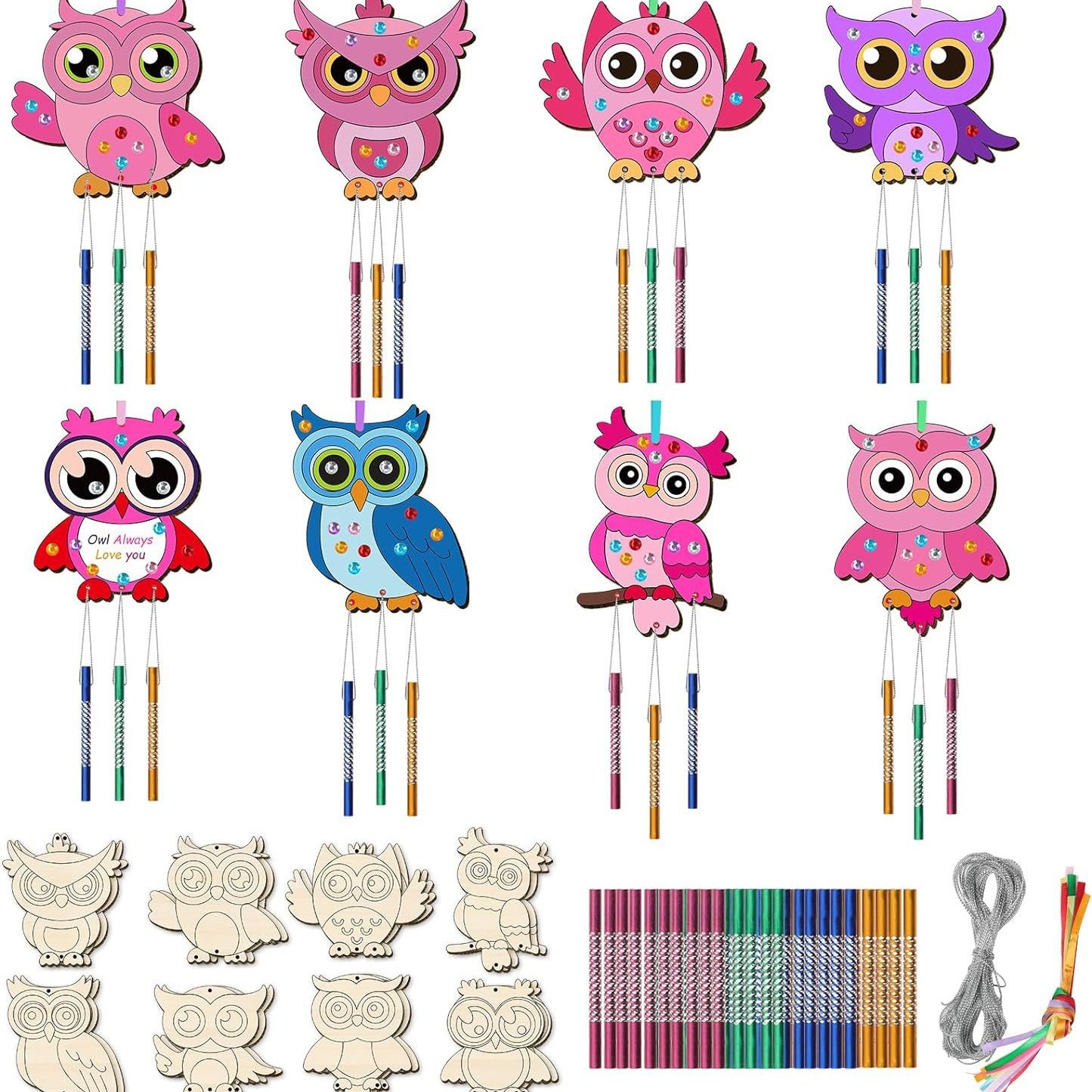 8 owl pieces +24 wind chimes + silver string + diamond + two pens