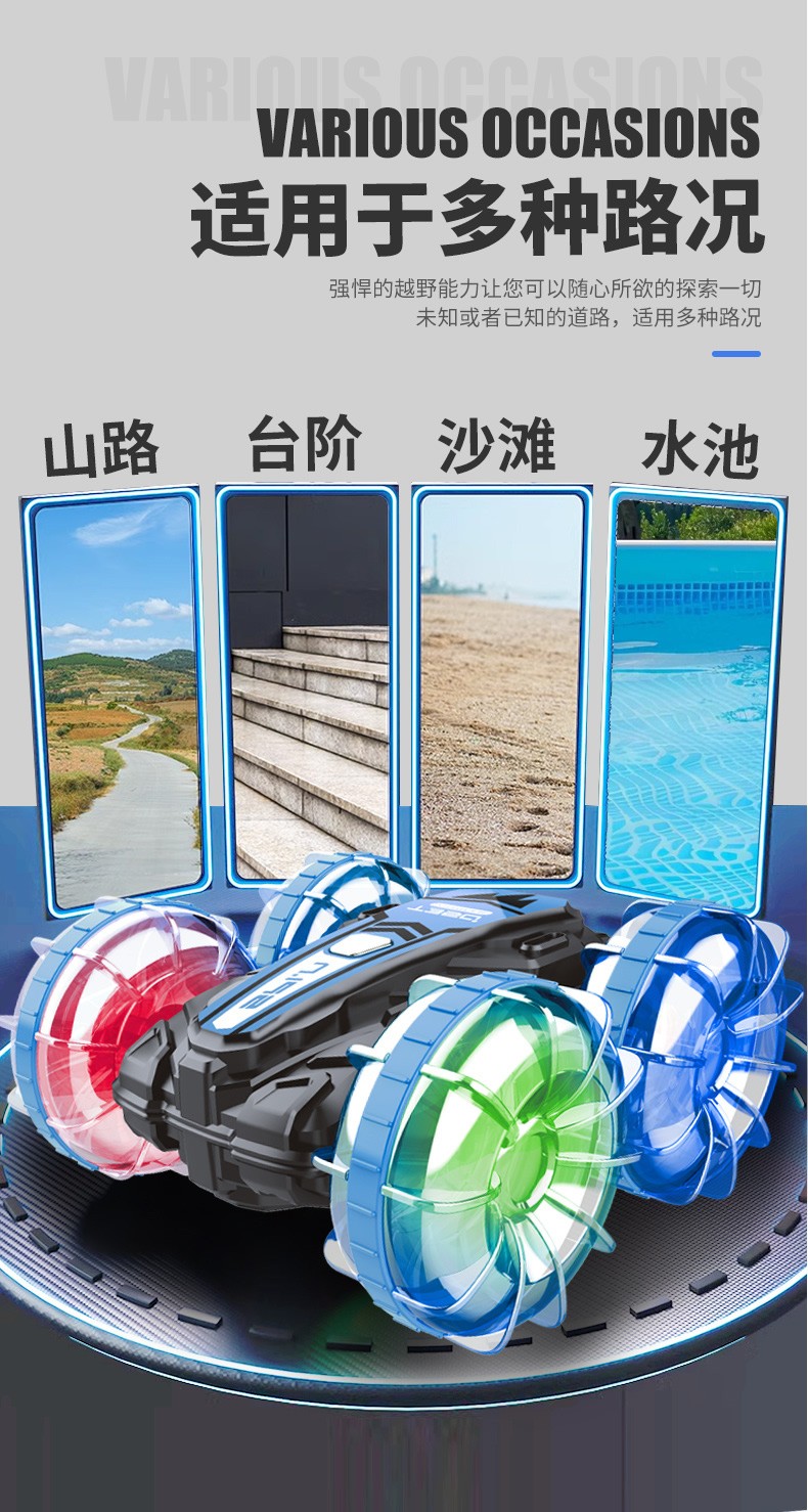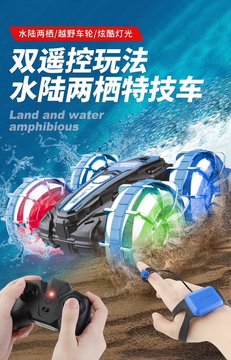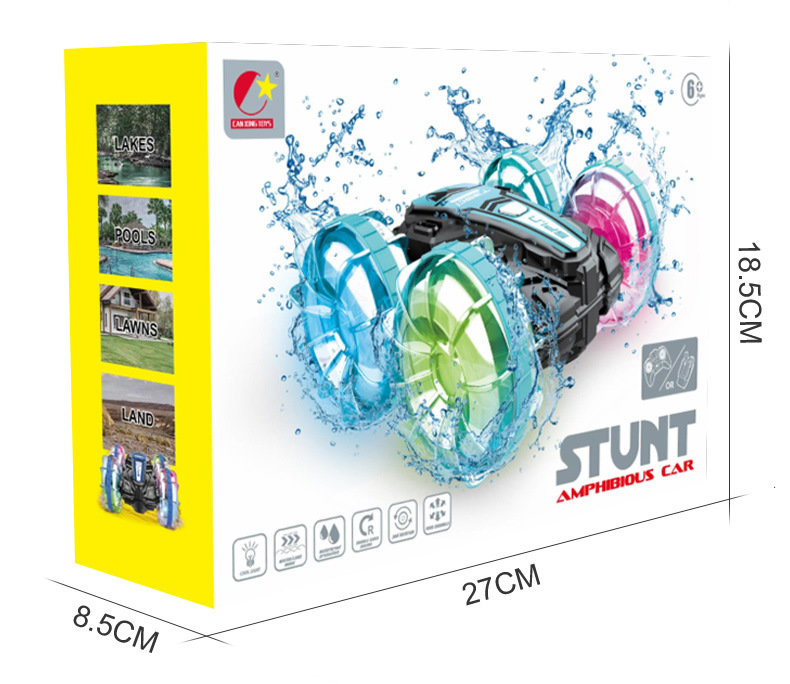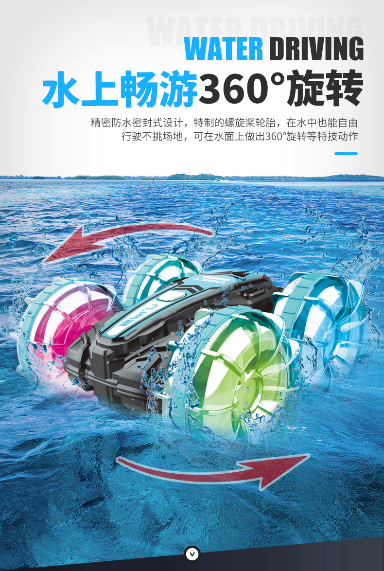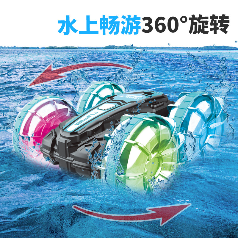 Function: 2.4G remote control, waterproof, amphibious, wheels with cool lights, forward and backward, rotation left and right, drifting, one-button demonstration;