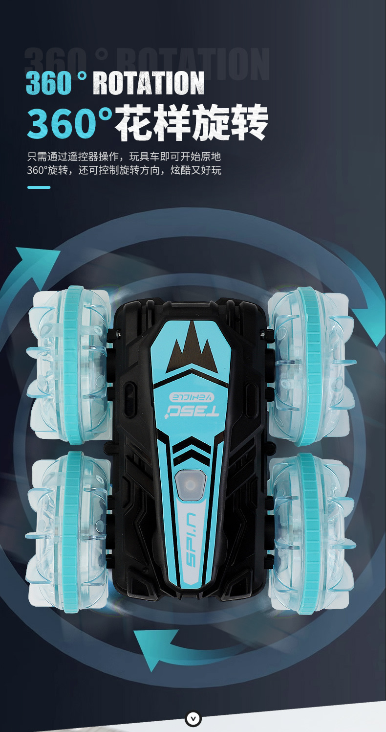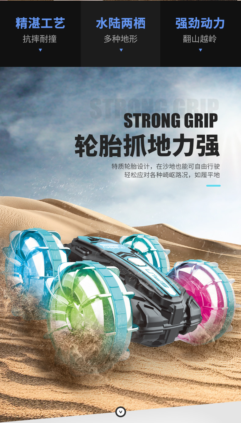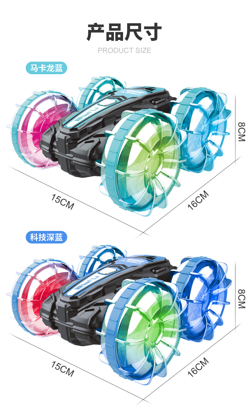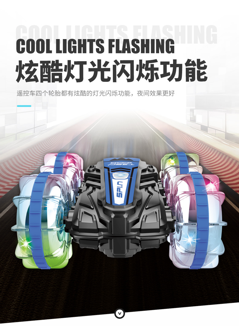 Function: 2.4G remote control, waterproof, amphibious, wheels with cool lights, forward and backward, rotation left and right, drifting, one-button demonstration;