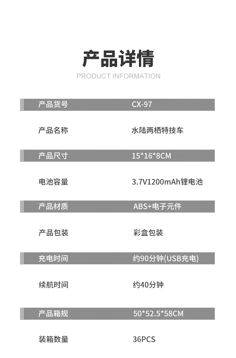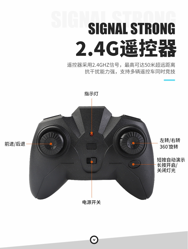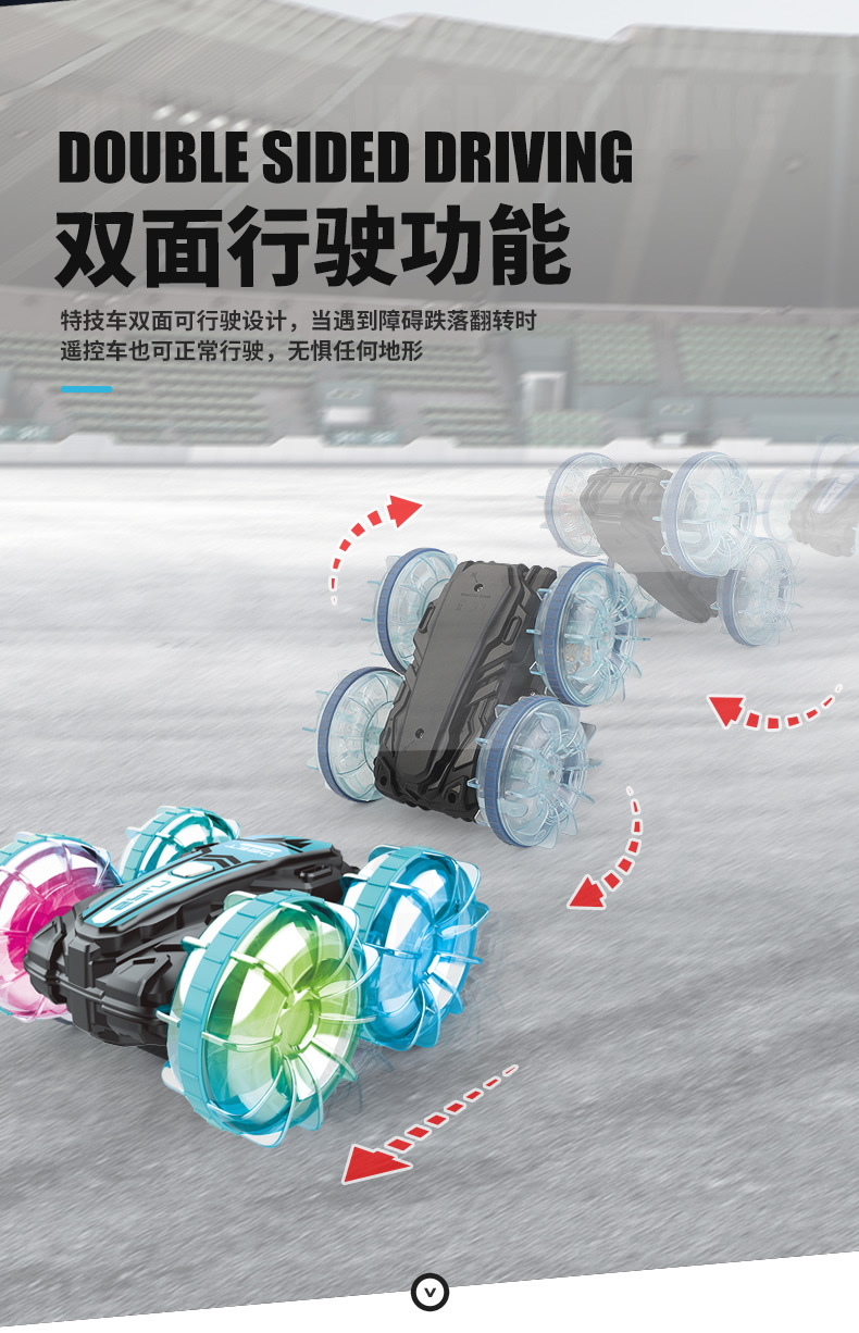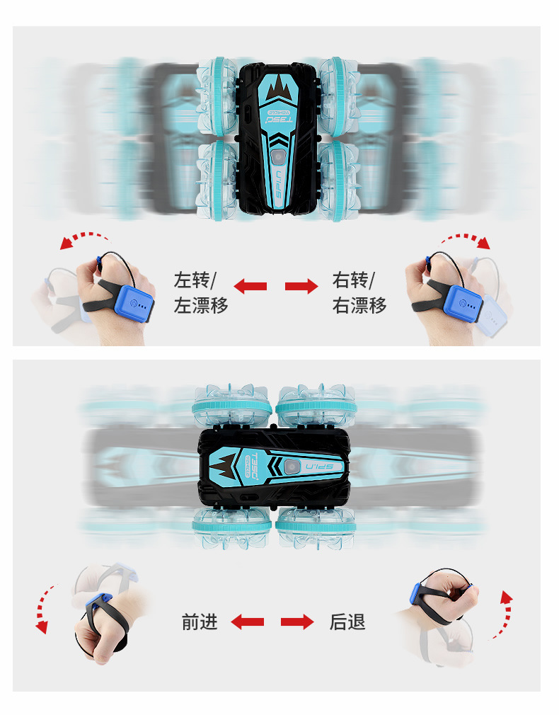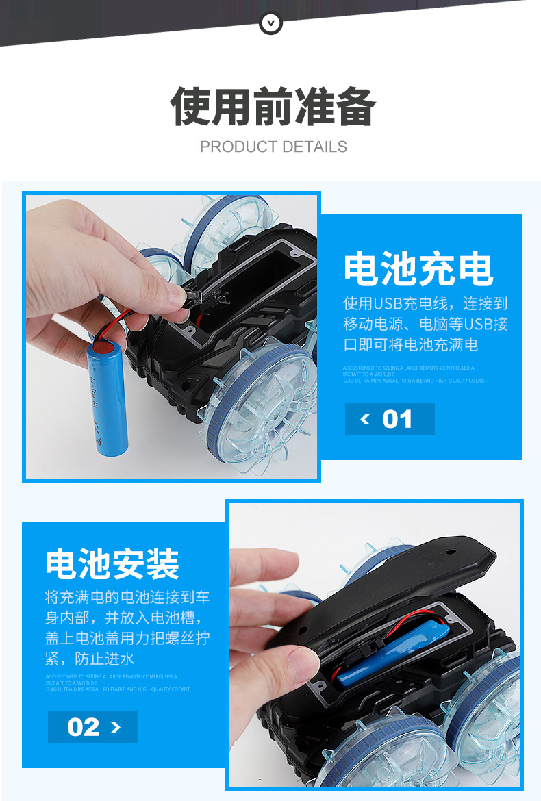 Function: 2.4G remote control, waterproof, amphibious, wheels with cool lights, forward and backward, rotation left and right, drifting, one-button demonstration;
