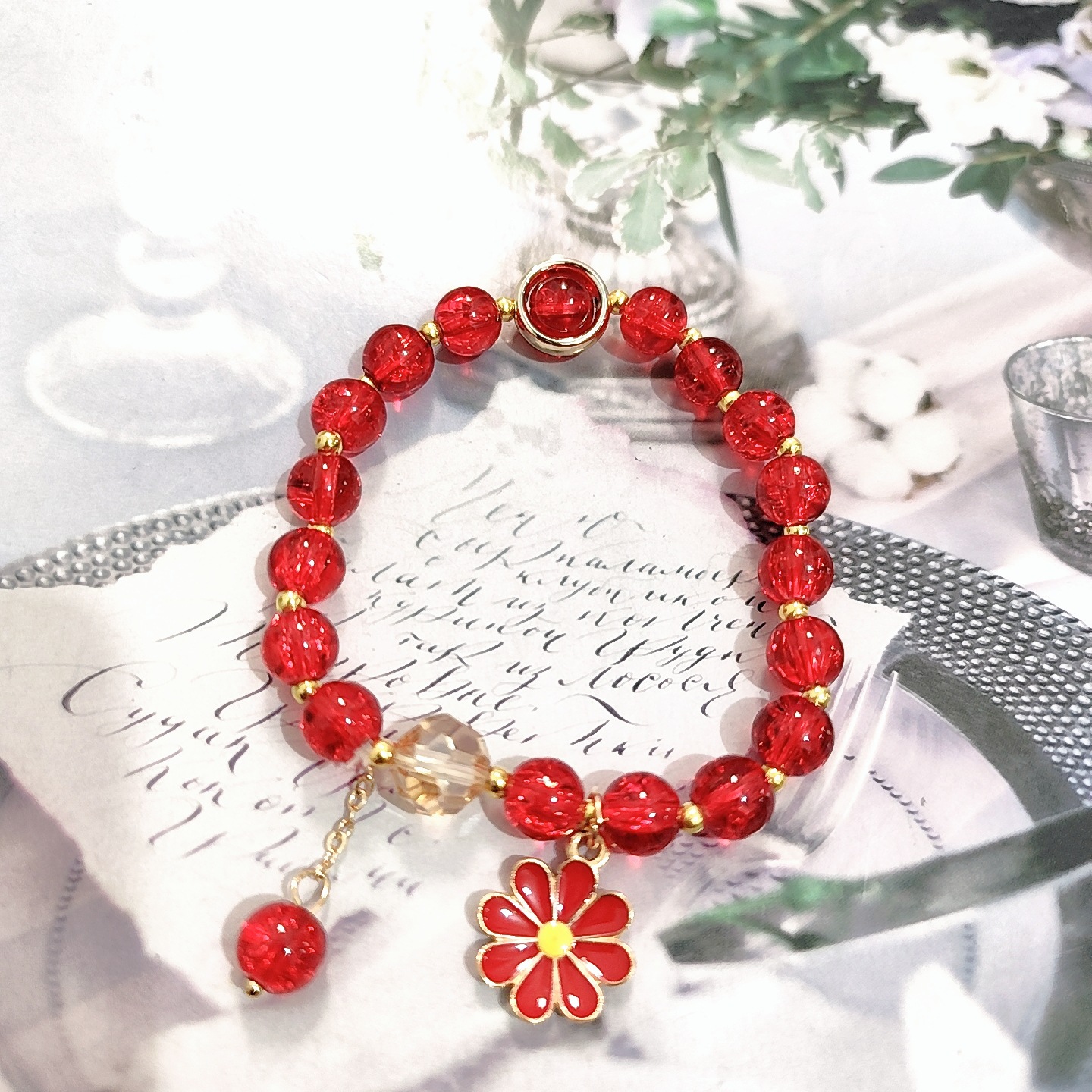 s137 red glass chipping beads daisy bracelet