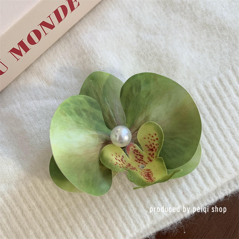 green-phalaenopsis pearl barrettes (raw silk)