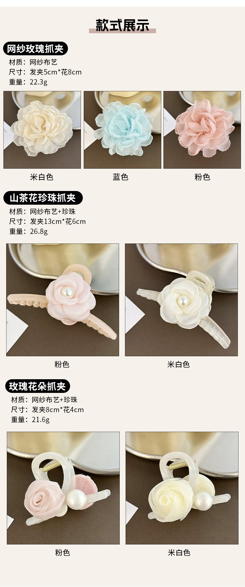 camellia pearl barrettes beige 6.5cm