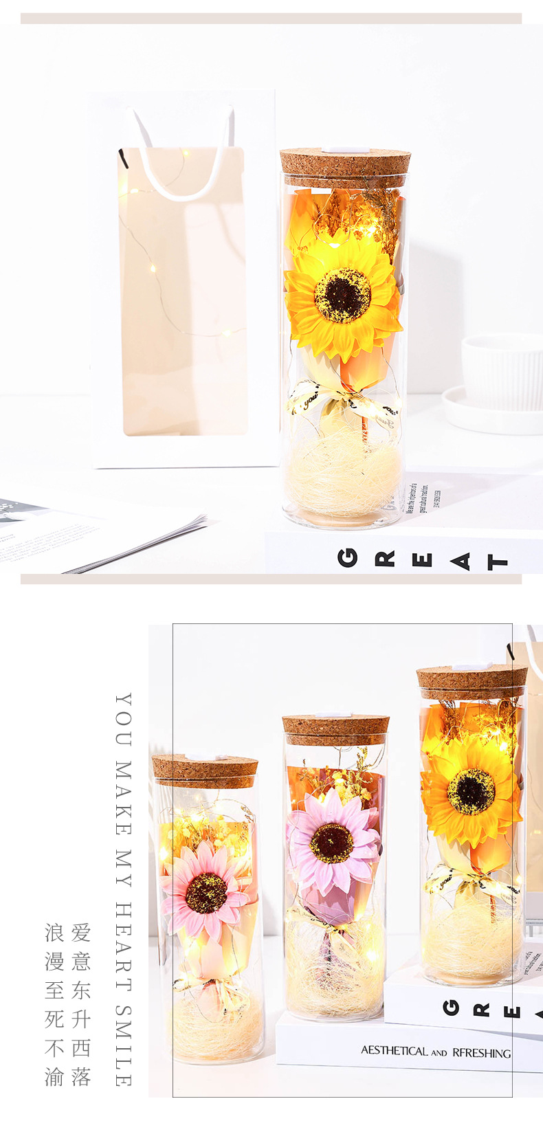 glass flower [yellow sunflower] + lamp + gift bag