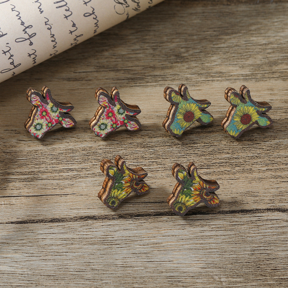 aliexpress new cartoon creative personalized wooden cow head three-piece set earrings european and american personalized sweet all-matching earrings