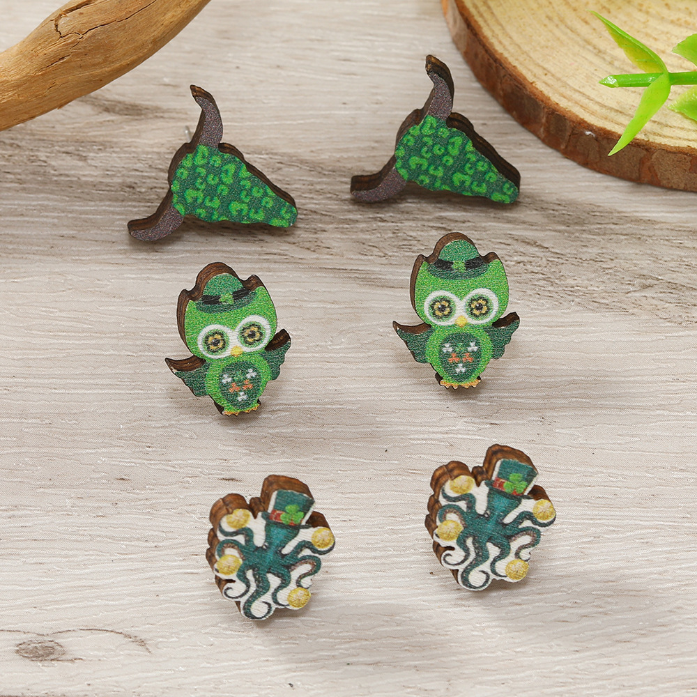 cross-border new arrival st patrick's day theme owl suit stud earrings personality creative printing wooden earrings for women
