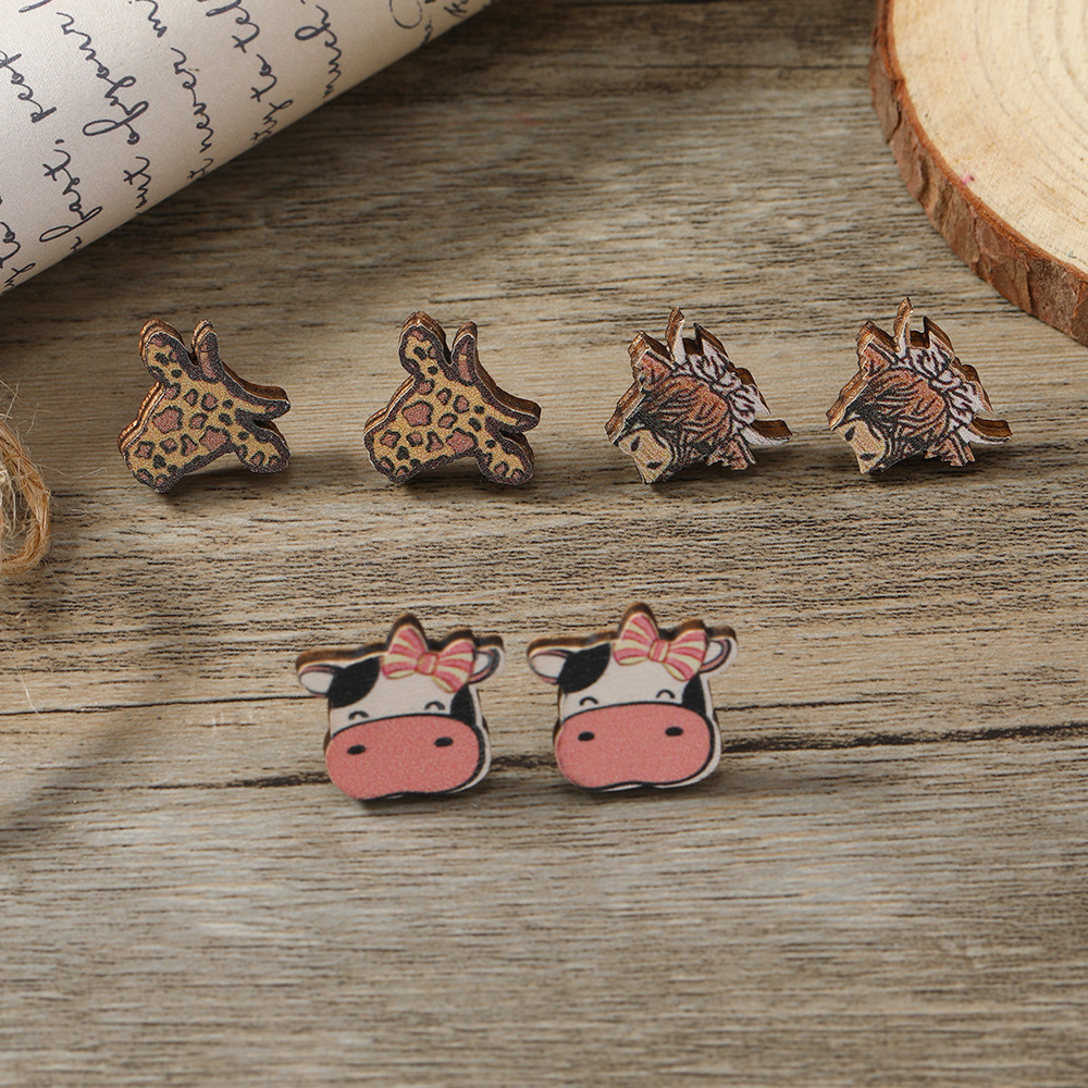 cross-border new unique creative cartoon giraffe cow suit stud earrings female european and american cute wooden printed earrings