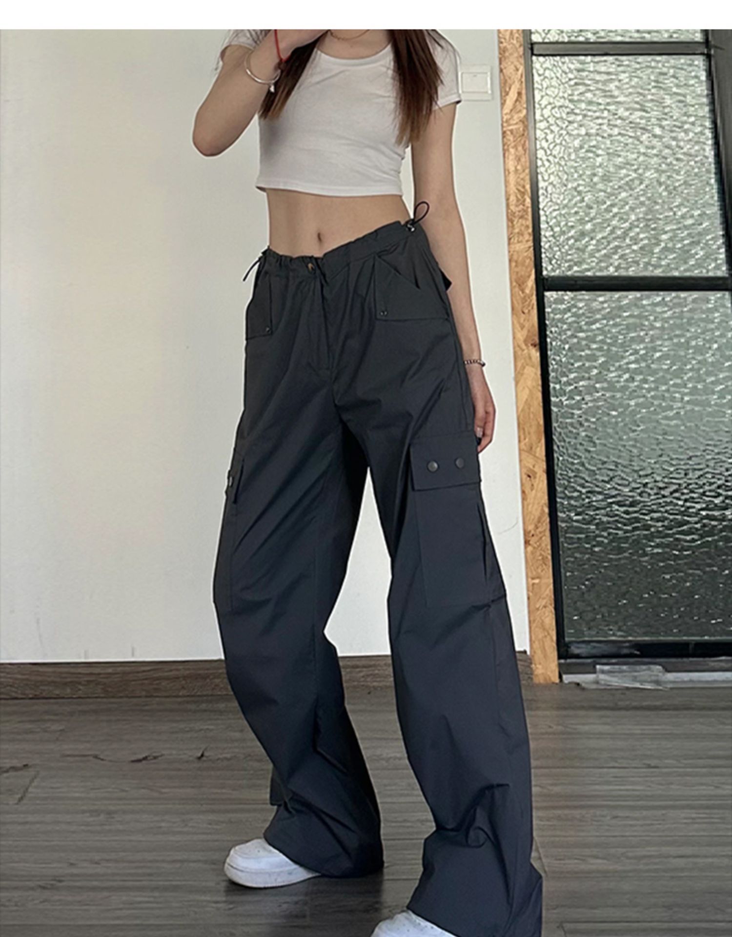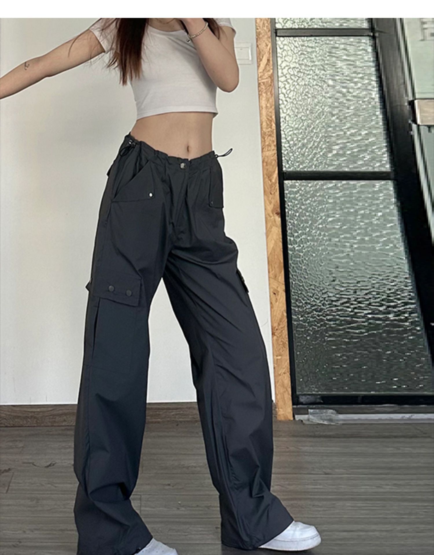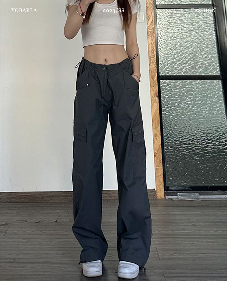 american dark gray straight cargo pants women's summer thin high waist plus size plump girls loose slimming and wide leg casual pants
