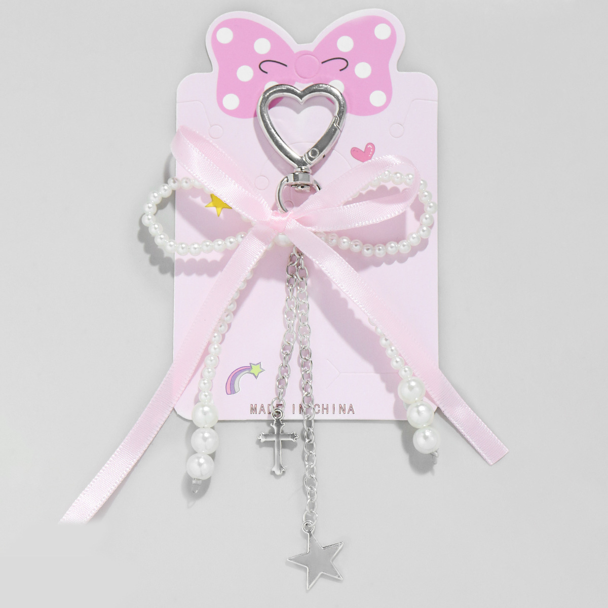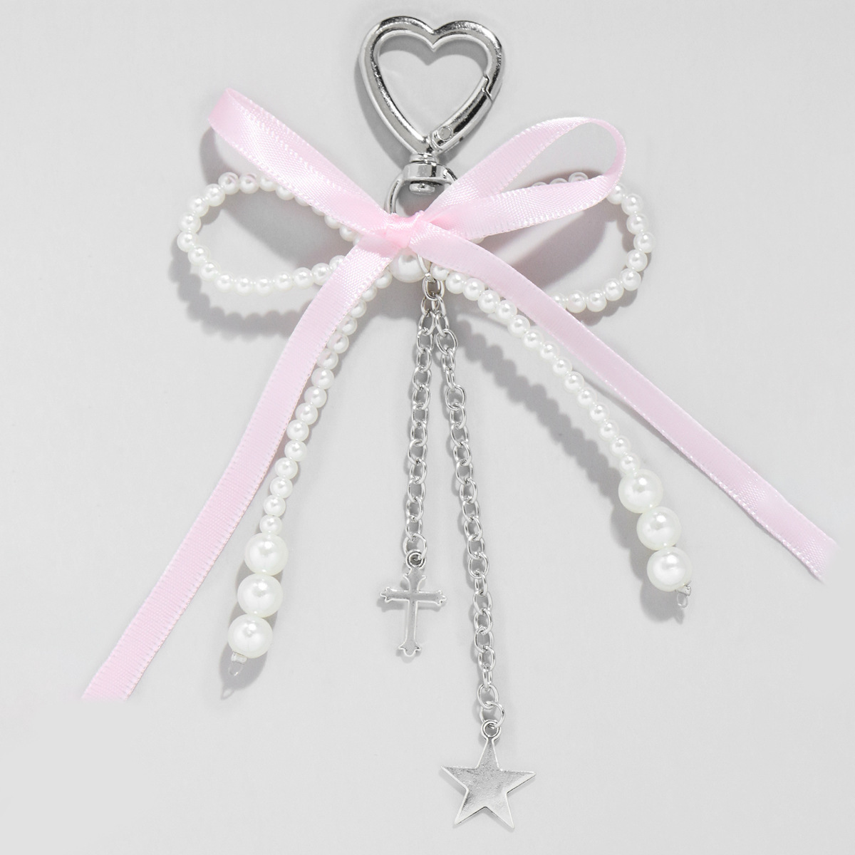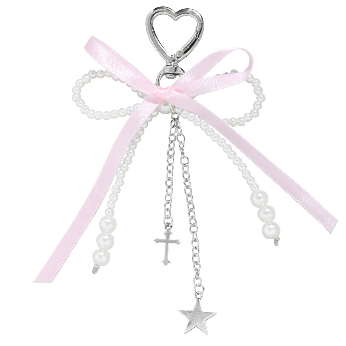 pink ribbon imitation pearl bow heart keychain 1